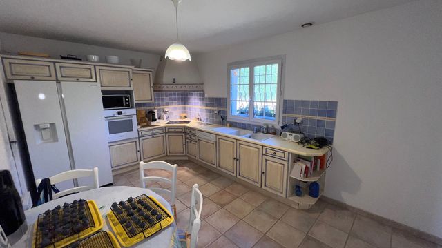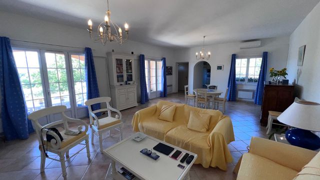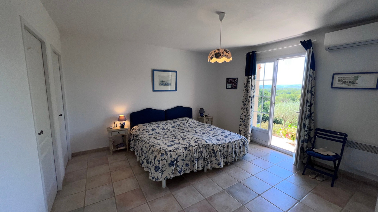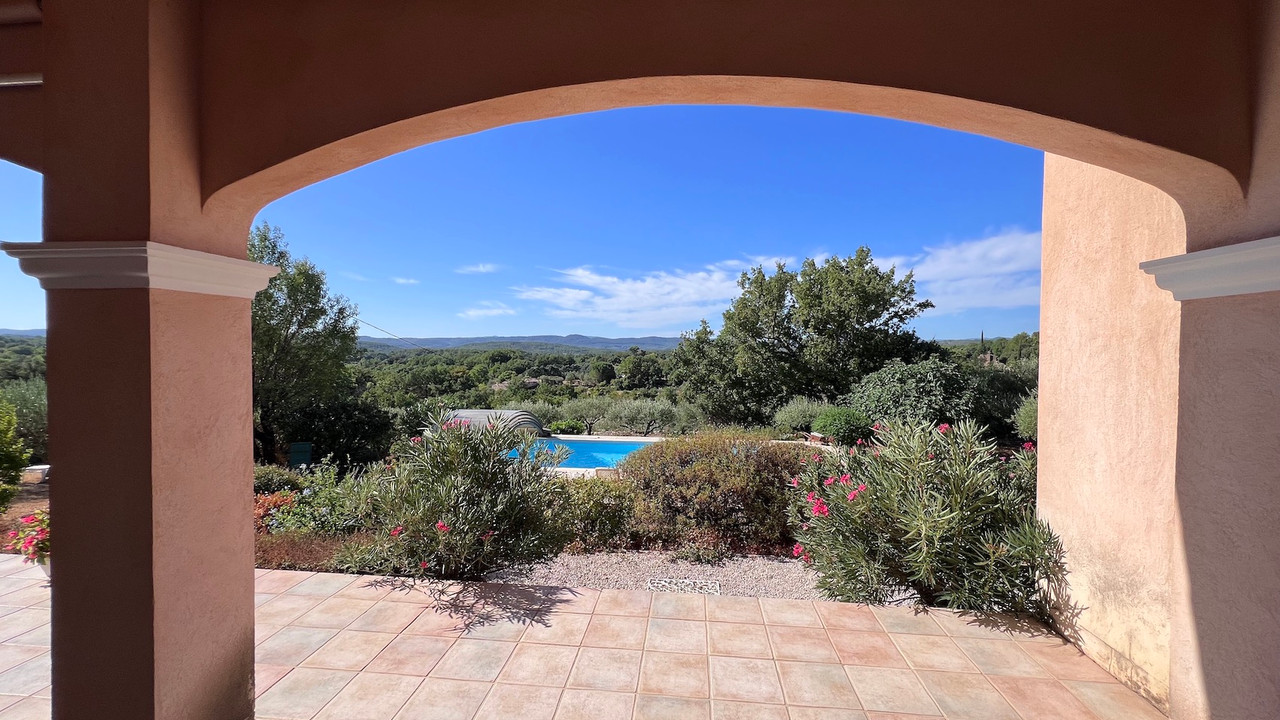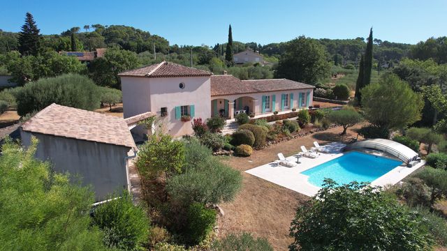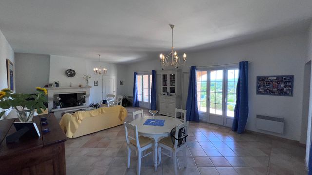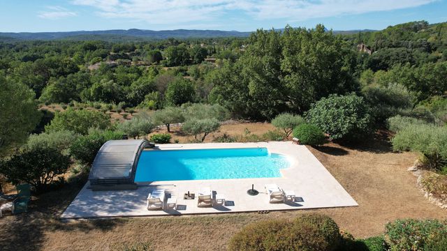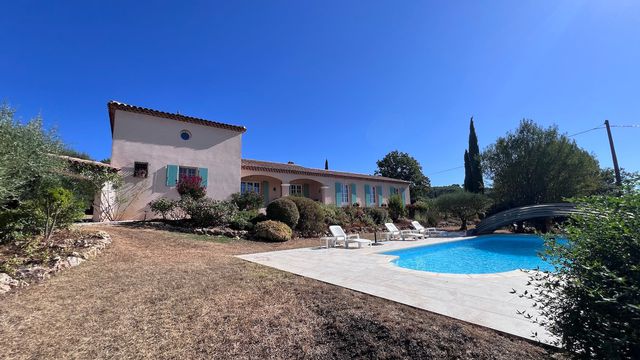 A40346GWI83 - Fabulous villa in Cotignac, Provence. This gorgeous provençal property is in a quiet location and not overlooked, near the village and all amenities, this house has 4,240 m² of land, planted with 80 olive trees and various Mediterranean plants. Enjoying complete privacy and tranquility, it offers exceptional panoramic views of the surrounding countryside. The garden features a lovely swimming pool.There is a large garage of 27m² and covered parking. On the ground floor: entrance hall, guest toilet, a large living/dining room of 45m² with a fireplace. This bright room opens onto a shaded south-facing terrace overlooking the pool and the fabulous views. A spacious, fully equipped kitchen with a dining area, a pantry/utility room, a master suite with bathroom and toilet, three additional bedrooms, a dressing room, a shower room and a separate toilet. The attic (37.8 m²) could be converted into additional living space. Large garage and carport. Situated in a sought-after area withing wal