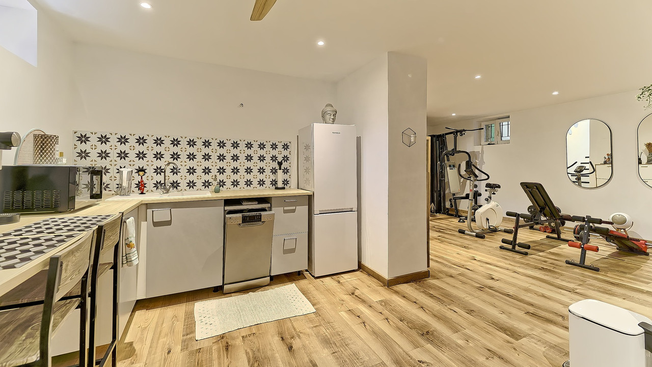 The highlight of this residence: its 100m² terrace designed as a true outdoor space. A semi-inground swimming pool, dining area under the olive tree, pétanque court, and unobstructed views of Saint-Paul Church create an ideal setting for long Mediterranean evenings.