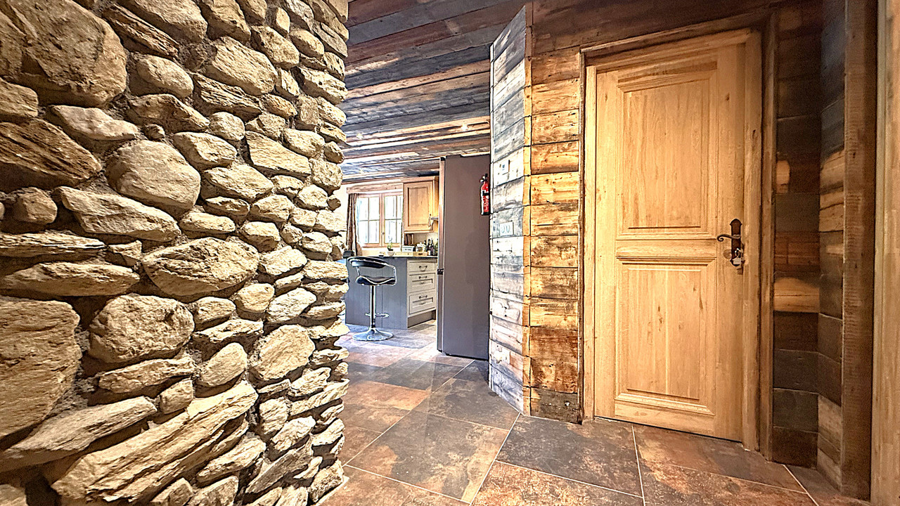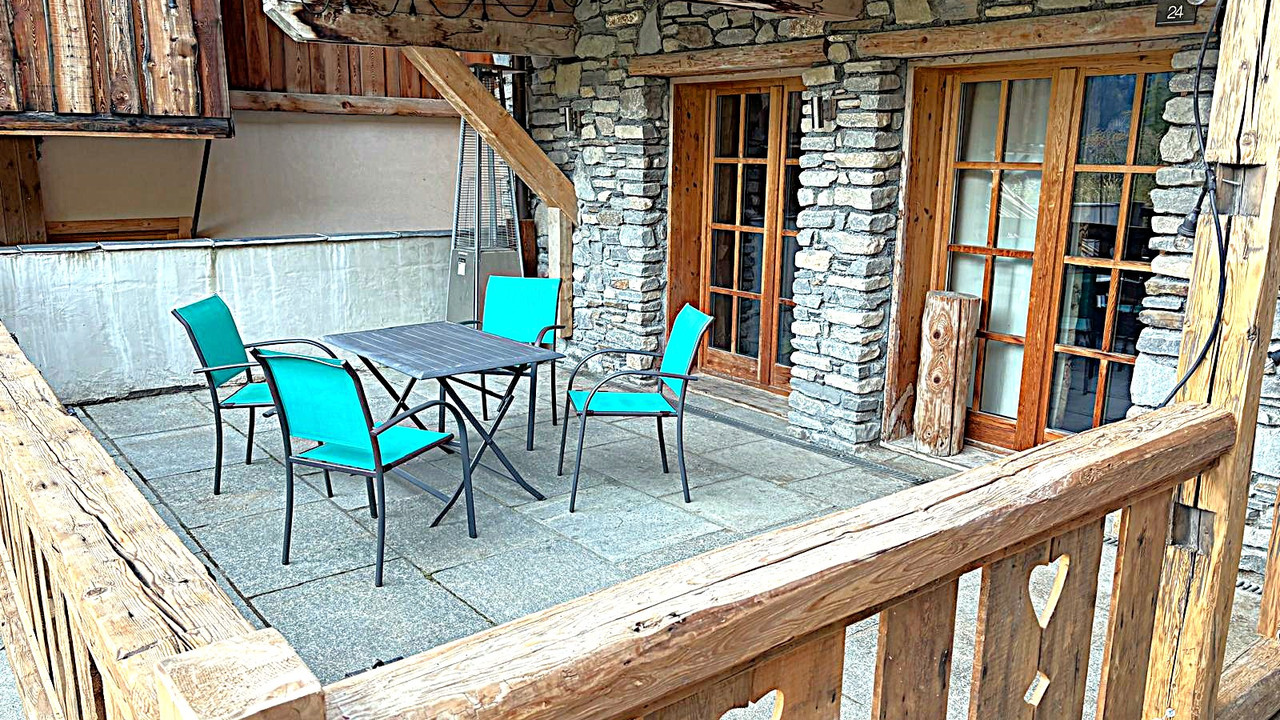 A37755JQB73 - Located in the heart of the Bataillette area of Sainte Foy Tarentaise a Large traditional Savoyarde style 1-bedroom apartment comprising an open plan living room with stone built fireplace and log burner, a fully equipped kitchen with island, a dining area with mountain views, a double bedroom with terrace to the north and a large bathroom.