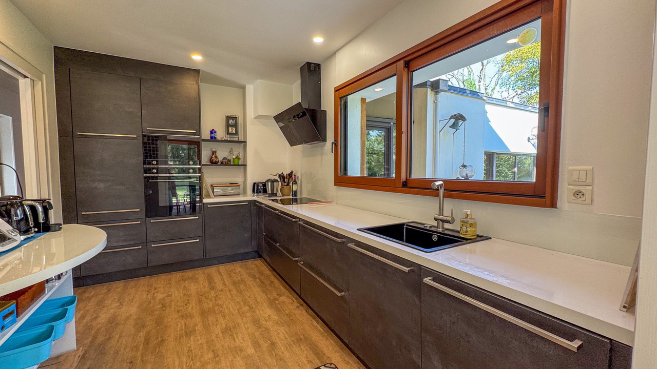 The house features spacious open-plan living areas, four bedrooms, and views over private parkland.