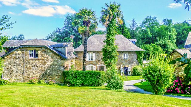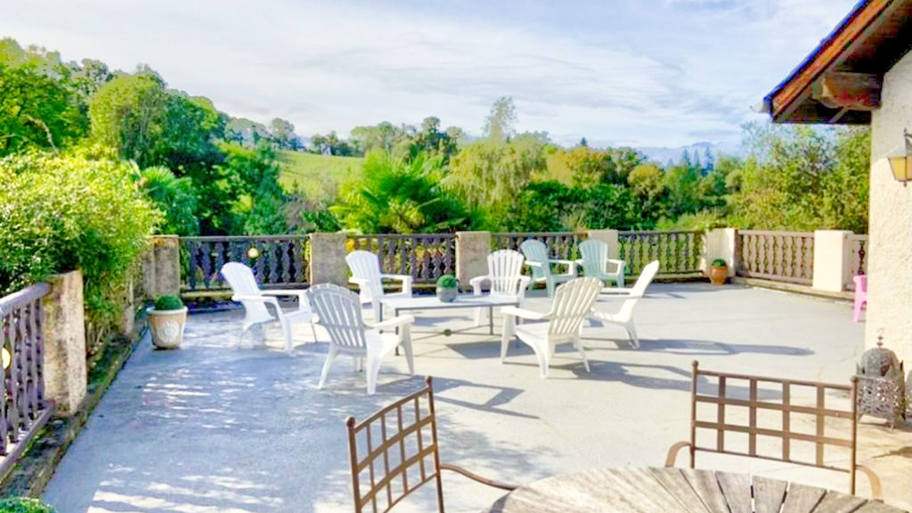 A19027CEL64 - Nestling in a magical hilltop setting in the beautiful Béarnaise countryside, this elegant country estate of 27 hectares has fabulous views of the Pyrénées, two exquisite farmhouses, a luxurious converted barn ideal for holiday rental with eight bedrooms, sauna and gym, three chalets on long-term furnished leases, stables for horses and a delightful swimming pool (14m x 7m) surrounded by a sun terrace.