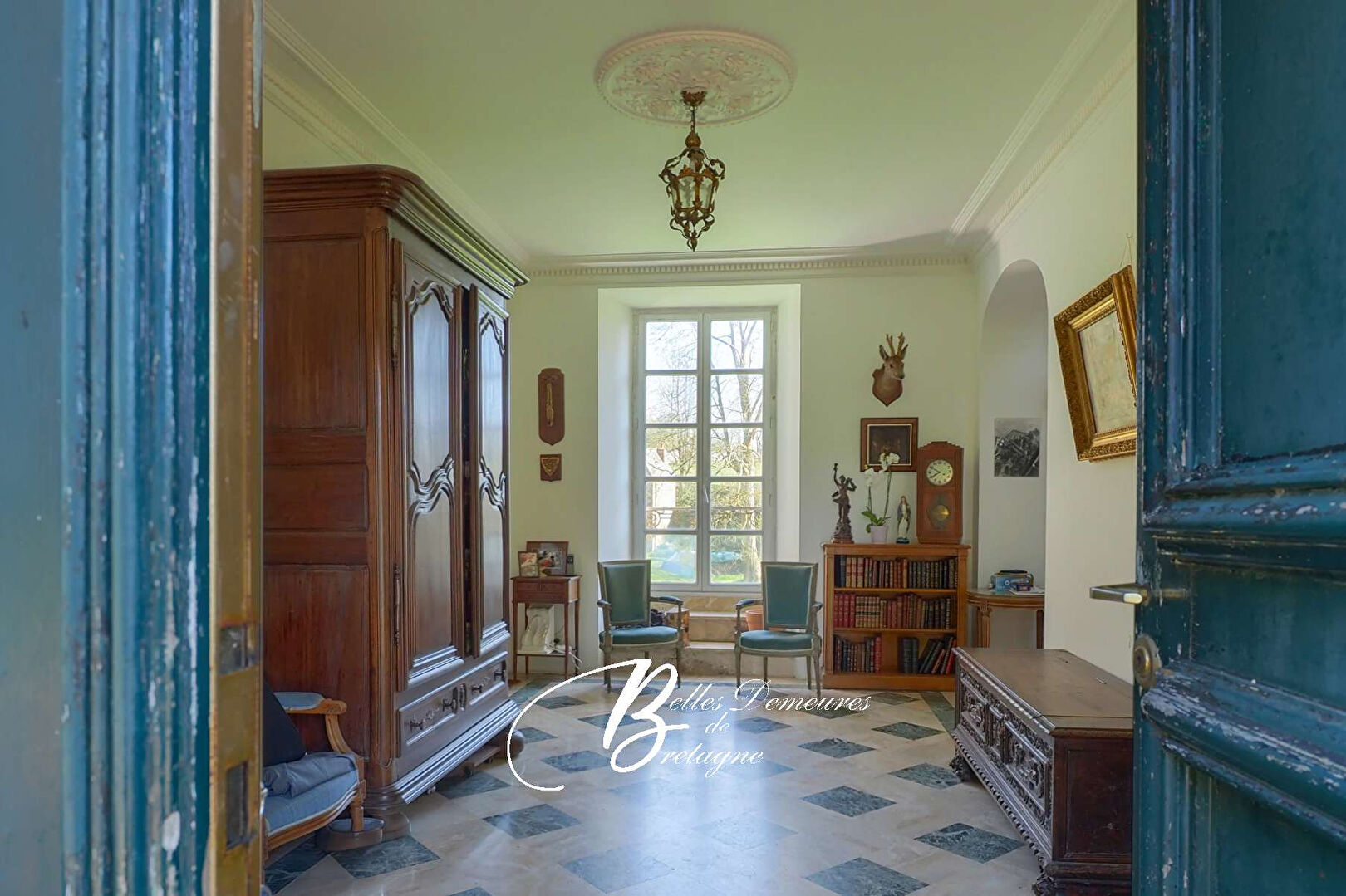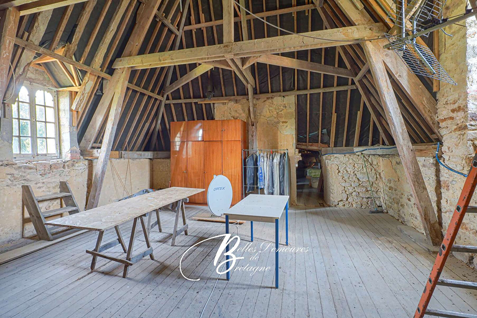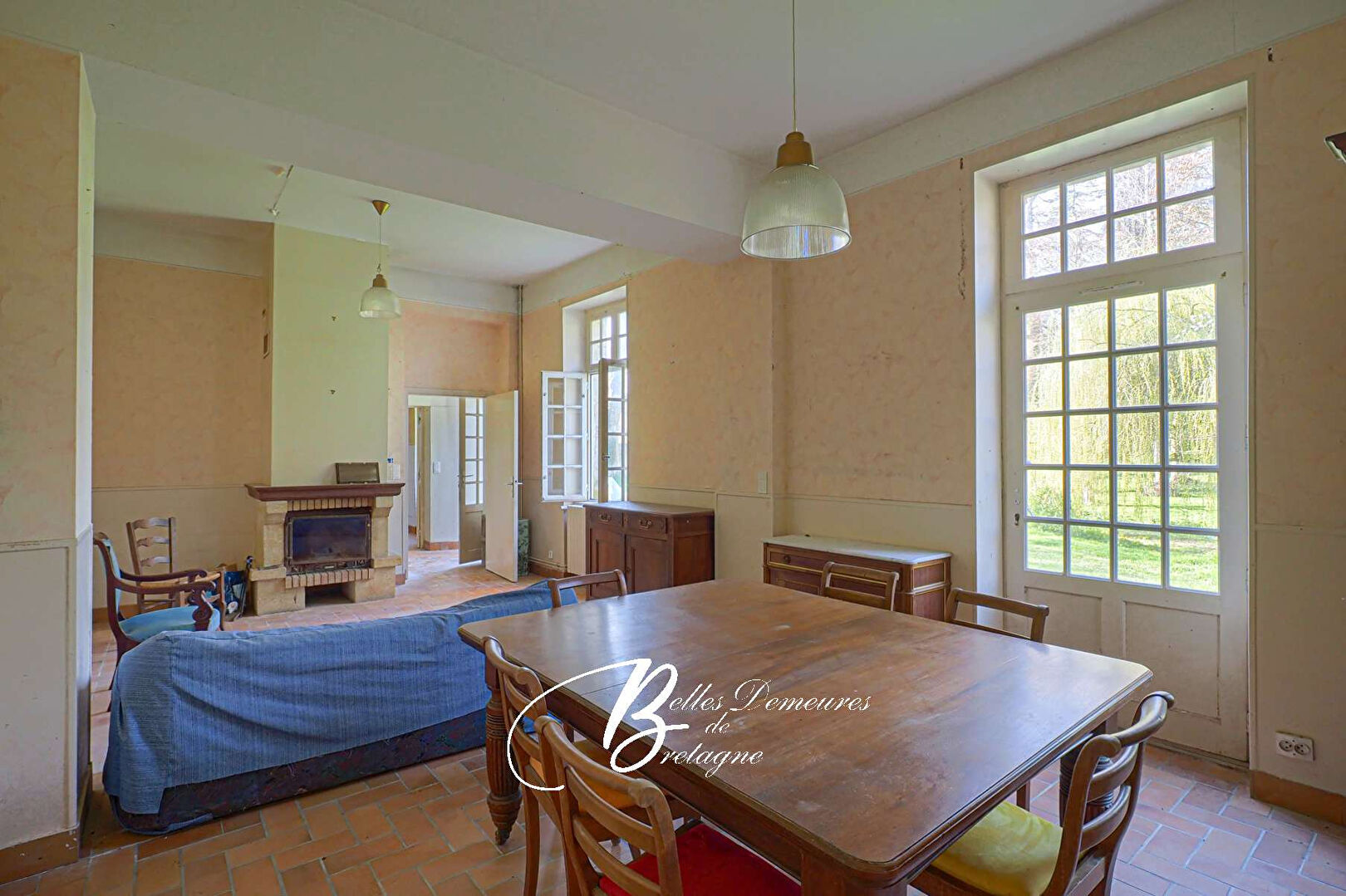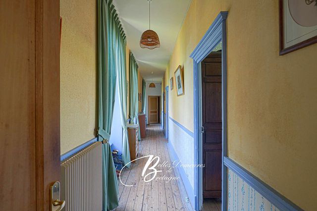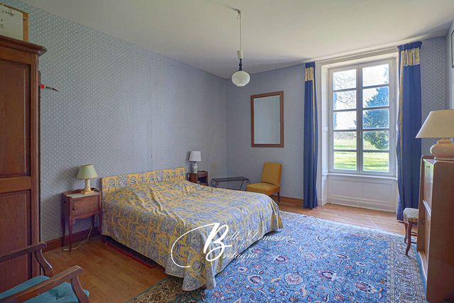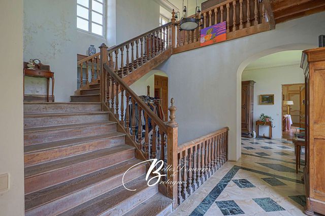 Descriptif :L’entrée s’effectue par un vaste hall doté d’un escalier central en bois. De chaque côté de celui-ci se trouvent un grand salon avec cheminée, une salle à manger également équipée d’une cheminée, une cuisine, une pièce à rénover, un grand cellier, une salle de jeux, une buanderie ainsi que des toilettes. Au premier étage : un palier dessert sept chambres, une suite avec salle de bains, une pièce à rénover, une salle de bains, des toilettes et un bureau avec bibliothèque. Au deuxième étage : cinq greniers. Au sous-sol : les anciennes cuisines du château avec de belles cheminées, une chaufferie et plusieurs celliers.