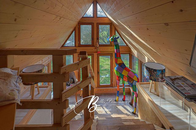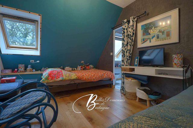 À l'étage, l'espace nuit se compose d'une partie dédiée aux enfants avec deux chambres mansardées et une salle de bains. L'autre aile accueille une suite parentale comprenant chambre, salle d'eau avec WC et dressing. Une petite pièce complète ce niveau.