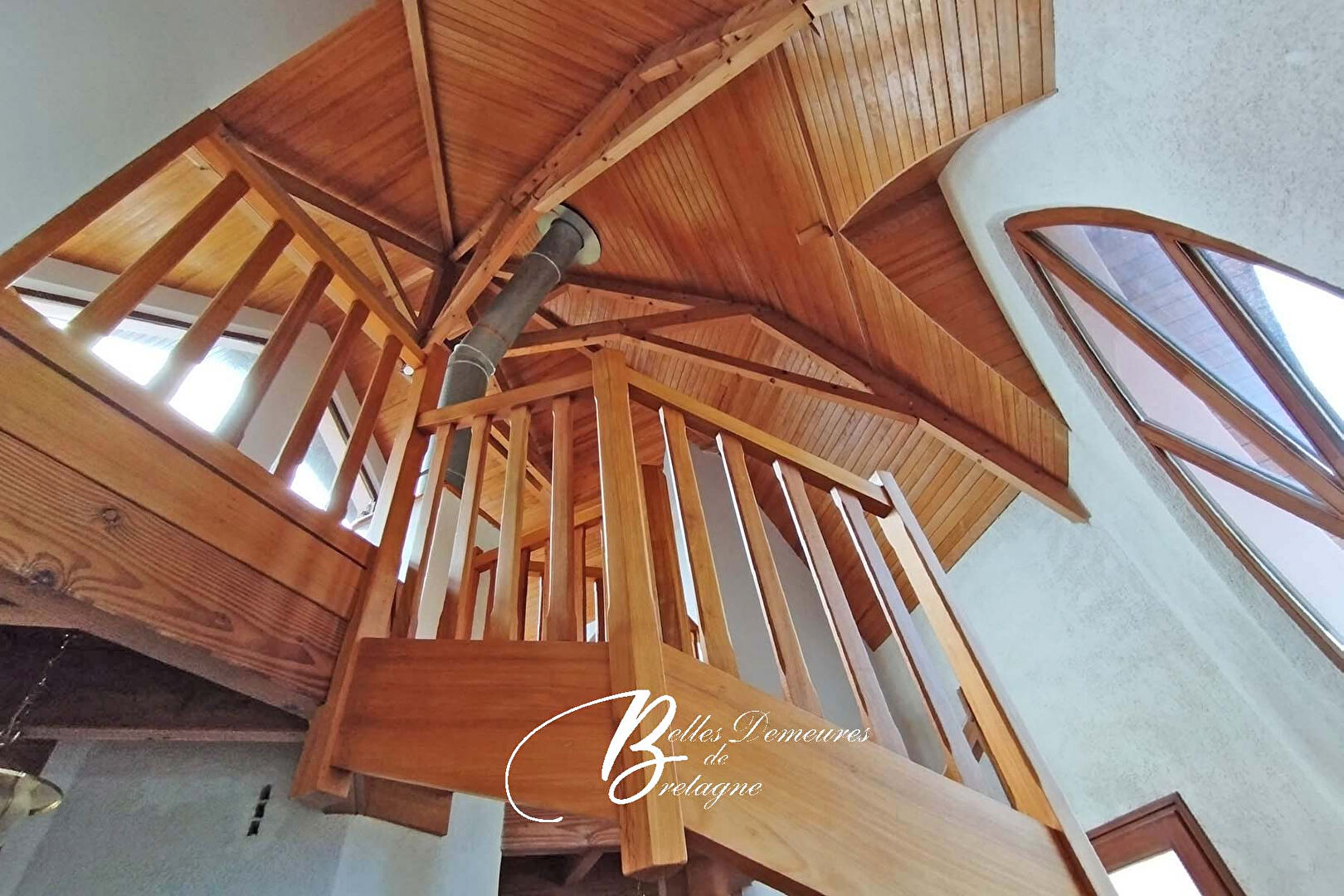 On est d'emblée charmé par l'architecture extérieure et intérieure de cette jolie maison. L'entrée donne le ton avec son plafond cathédrale, sa charpente en bois apparente et son bel escalier desservant l'étage.