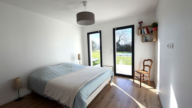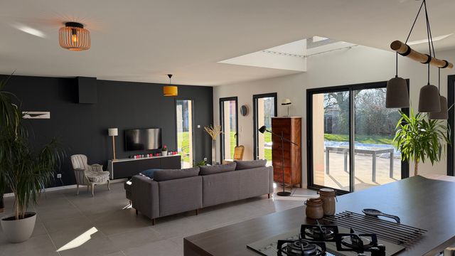 The elegant and inviting living area combines an open-plan kitchen, dining room, and cozy living room, all bathed in light. The sleeping quarters offer four uniquely proportioned bedrooms, including a superb suite with a bathroom and dressing room opening onto the landscape. Upstairs, a bright relaxation area inspired by catamaran nets creates an original and airy living space.