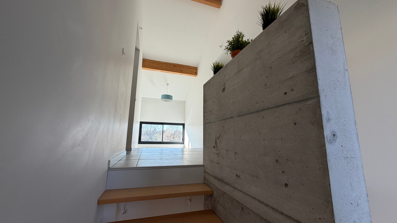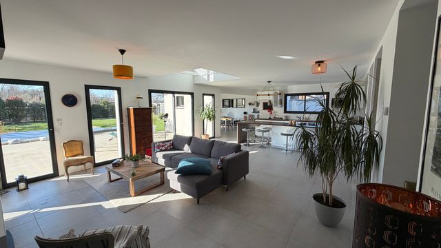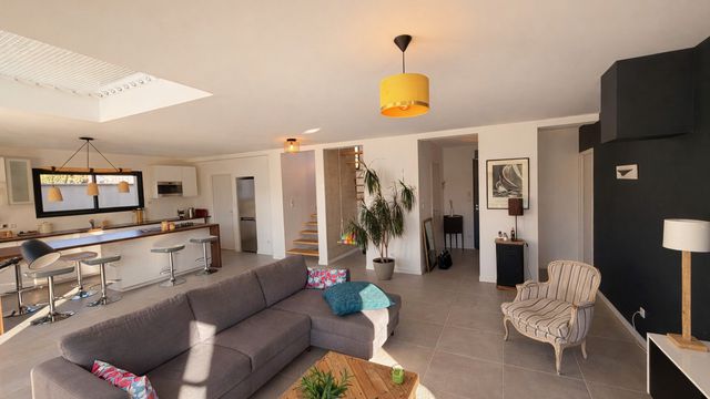 A42950DVI69 - In Saint-Genis-Laval, nestled in a protected environment, this recently built architect-designed house of 178 m² captivates with its contemporary lines, exceptional natural light, and panoramic views of the surrounding countryside. In immaculate condition, it boasts high-end features: underfloor heating throughout, large bay windows with programmable roller shutters, integrated lighting, and premium appliances.