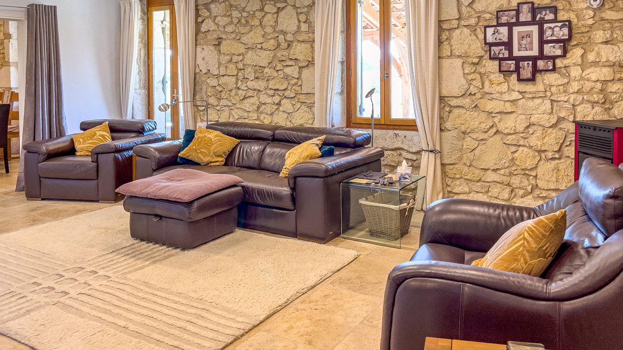 A40621AT47 - In a peaceful countryside setting, this beautifully restored stone home enjoys an elevated position with mesmerising views towards a distant hilltop village. Calm and private, yet close to the bastide towns of Duras and Eymet, it perfectly blends character and comfort.