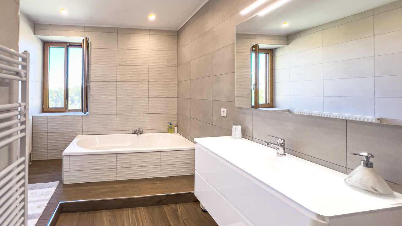 Light-filled living spaces open onto a spacious wrap-around terrace, ideal for outdoor dining and relaxation. The ground floor includes a generous kitchen-dining room, inviting living room with pellet-burner, second reception and guest cloakroom/WC. Upstairs are a principal suite with dressing room and en-suite, two double bedrooms, and a bathroom.