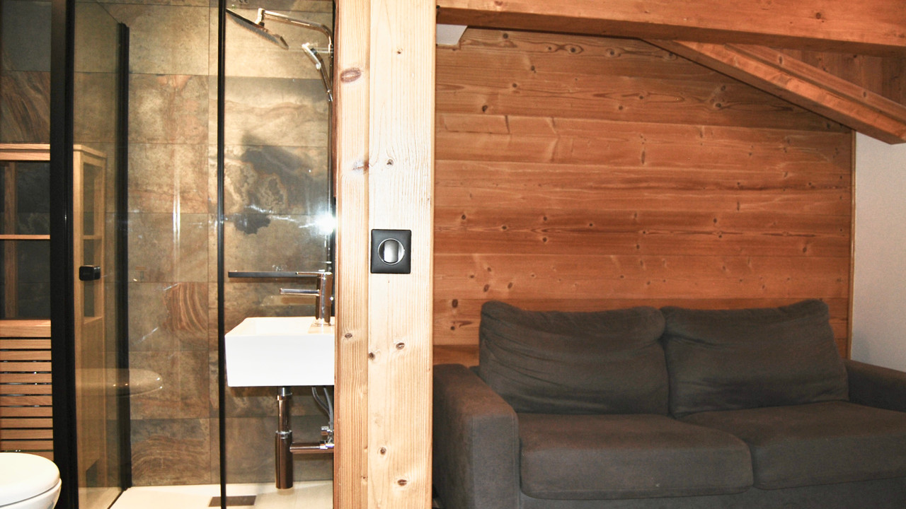 The apartment features three bedrooms, two with en-suite bathrooms equipped with a shower, washbasin, and WC. The third bedroom shares an additional separate bathroom (3rd bathroom) with a shower, washbasin, and WC with the walk-through 'Coin de Montagne' equipped with a double sofa bed and a private TV. All of the bathrooms have towel warmers & the whole apartment has underfloor heating with individual thermostats.