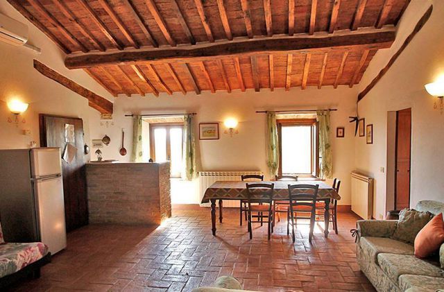 The property has all the typical features of the Tuscan rustic style, such as terracotta floors, exposed wooden beams, brick arches and a stone facade.