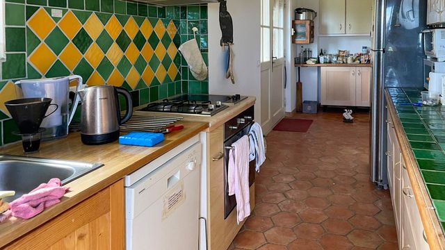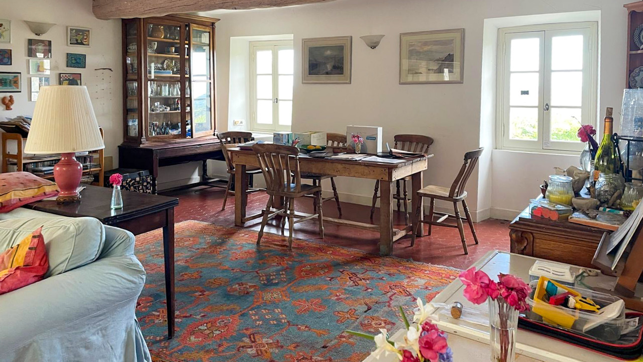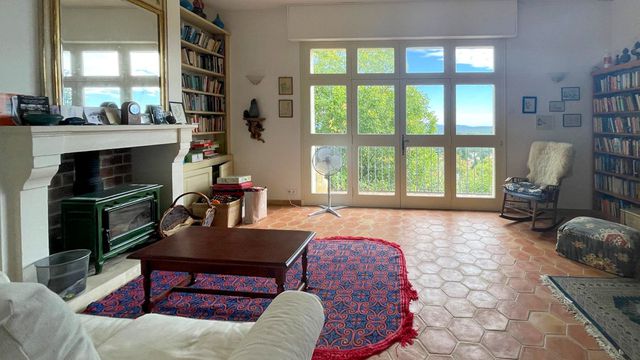 The home offers a warm living atmosphere with a lounge and fireplace opening onto a terrace, a study, a living/dining room with wood-burning stove, and a bright kitchen leading to a canopy. Upstairs, there are three bedrooms—including one with an en-suite bathroom—and additional flexible spaces. The garden level includes a cellar and storeroom, and the property also benefits from an independent two-room apartment to renovate.