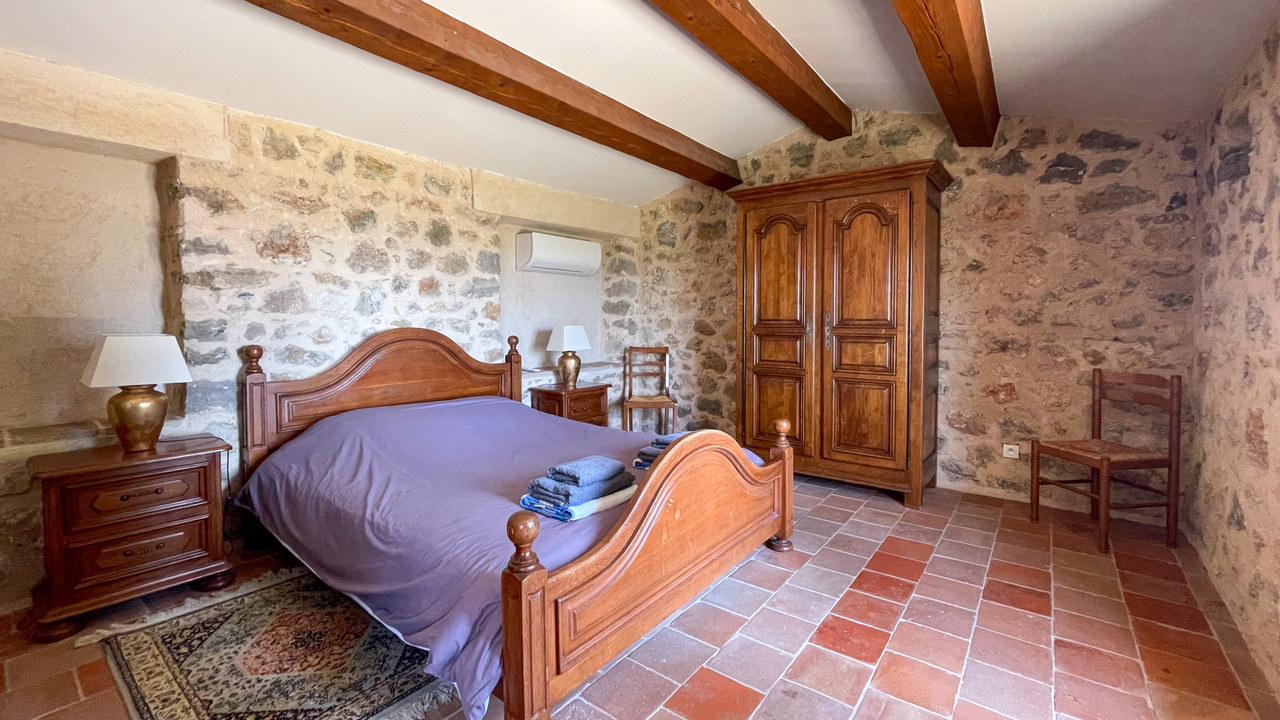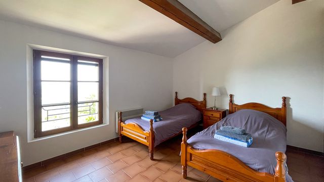 This spacious 5-bedroom home features a master suite with en-suite, air conditioning in all bedrooms, and a top-floor bedroom with private shower room and breathtaking views. The garden level includes a cozy living room with open fireplace, a traditional farmhouse kitchen with exposed beams and pantry, guest WC, and an additional en-suite bedroom. French doors lead to a covered terrace with BBQ, perfect for alfresco dining.