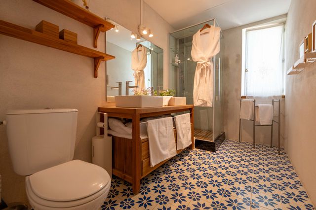 Bathroom: Modern and spacious bathroom featuring double sinks, shower, WC, and underfloor heating