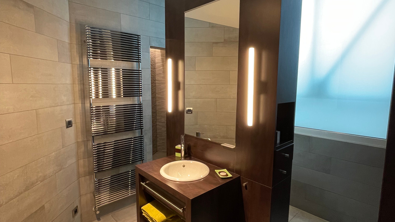 The magnificent 45 m² green terrace adds a very nice volume to the living space on the ground floor where wood, glass and metal are in perfect harmony.