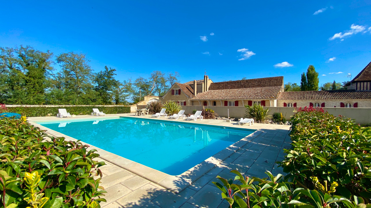 The manor's three gîtes (195 m², 131 m², 135 m²) combine period charm with tasteful renovation, with access to two pools and spacious terraces.