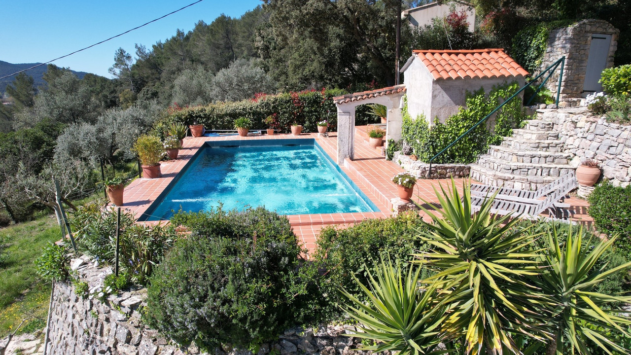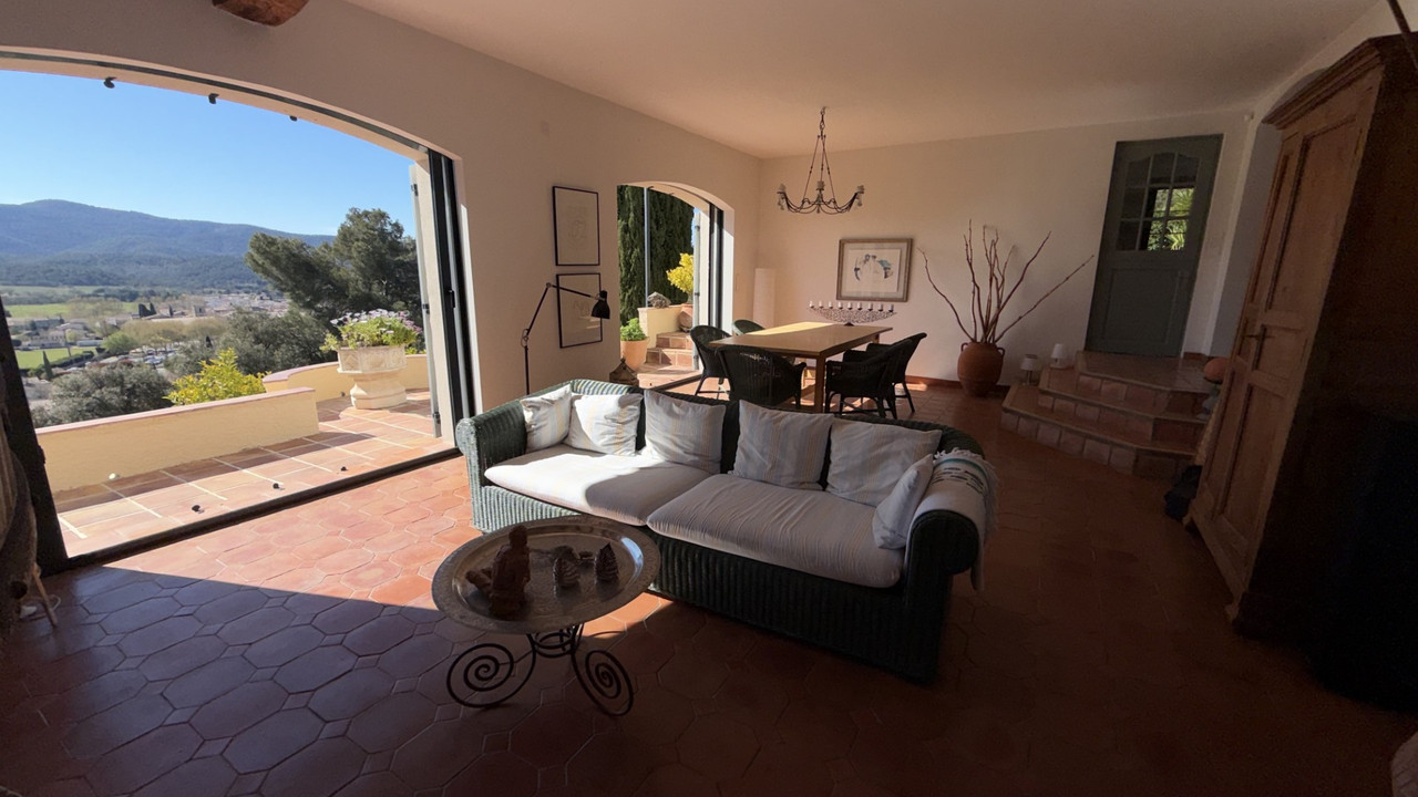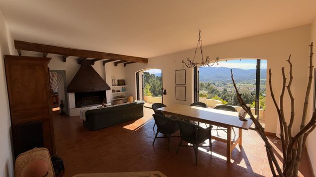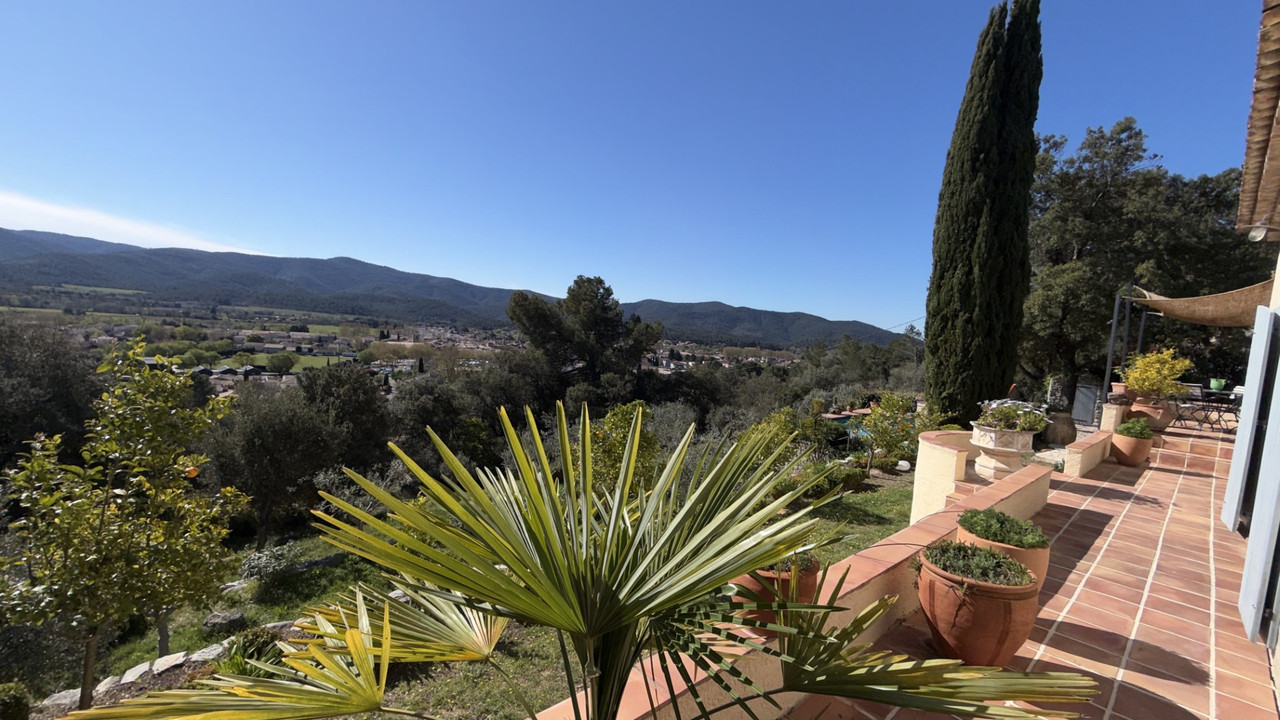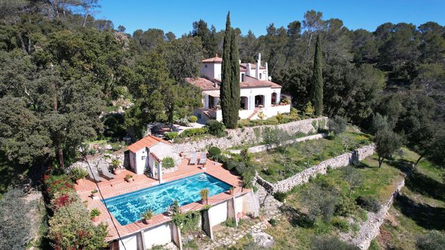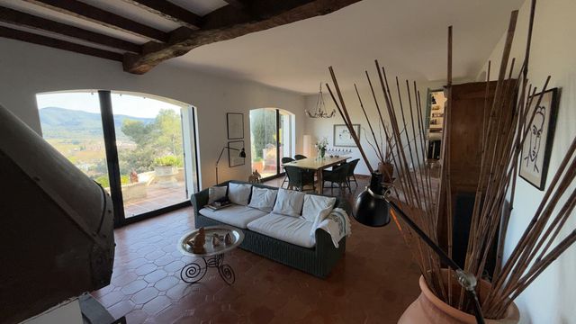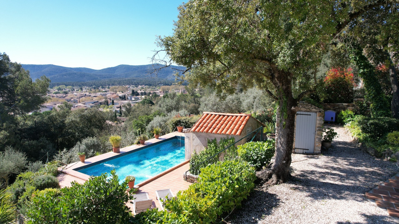 A44011GWI83 - Property in Provence with fabulous views. 30 minutes from Toulon, Hyères, and the beaches of the Med coast, in a protected environment, this property is located in Pignans, a charming Provençal village. Dominating the landscape, in absolute tranquility and complete privacy. Provençal house with over 11,400 m² of grounds. Facing south, the property benefits from spectacular views of the village and surrounding hills. On the ground floor : an entrance hall leads to a spacious living area comprising a living room and a dining room with a fireplace, opening onto a terrace. The fully equipped, separate kitchen includes a dining area and opens onto a pleasant terrace. There is also a pantry / laundry room, two bedrooms, shower room, toilet, office (or additional bedroom) with storage space. Upstairs : bedroom with a private sun terrace, two further bedrooms, a separate shower room, toilet. The fabulous pool and garage completes the property. This property combines elegance and serenity,