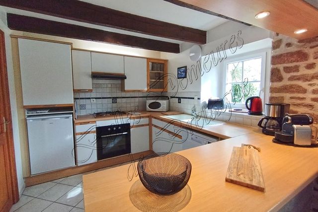 La cinquième habitation, d'environ 80 m², offre tout le charme typique des petites longères bretonnes. Le salon est équipé d'un poêle à bois et la cuisine est ouverte sur la pièce de vie. A l'étage, se trouvent deux chambres.