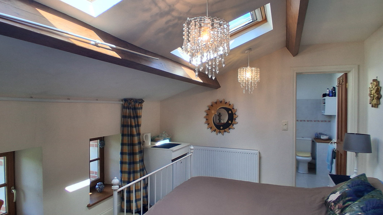 The main house offers four double bedrooms, while a self-contained annexe apartment provides excellent flexibility. The annexe includes a sitting room, fitted kitchen and shower room, with a spiral staircase leading to a large bedroom above, making it ideal for guests or independent living. The property enjoys magnificent views of the Donjon castle to the front, while to the rear there are far-reaching views across the Vendéen countryside, offering a rare combination of historic village centre living and open rural outlooks.