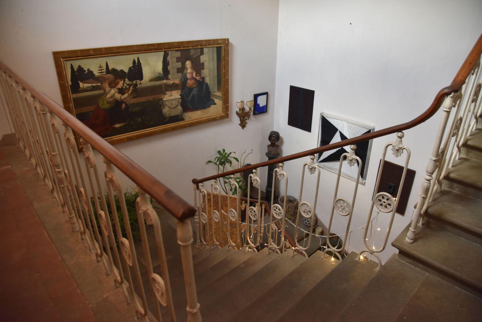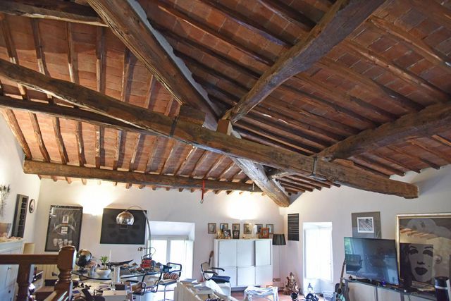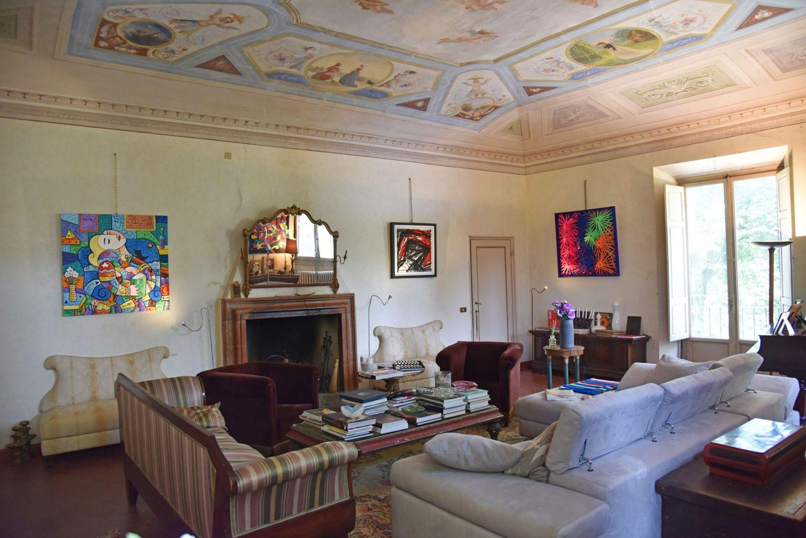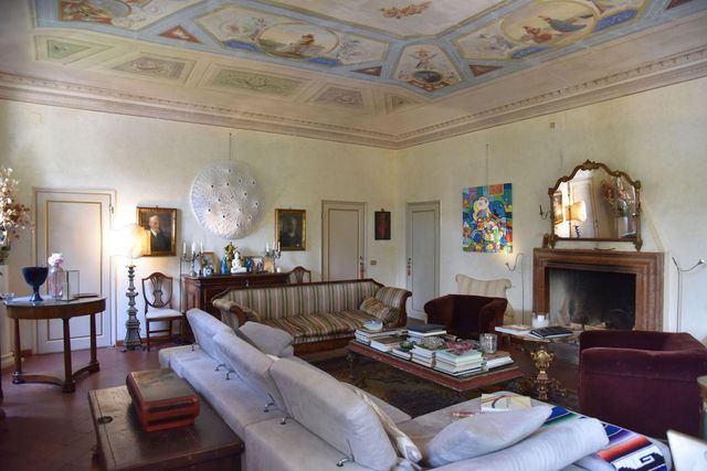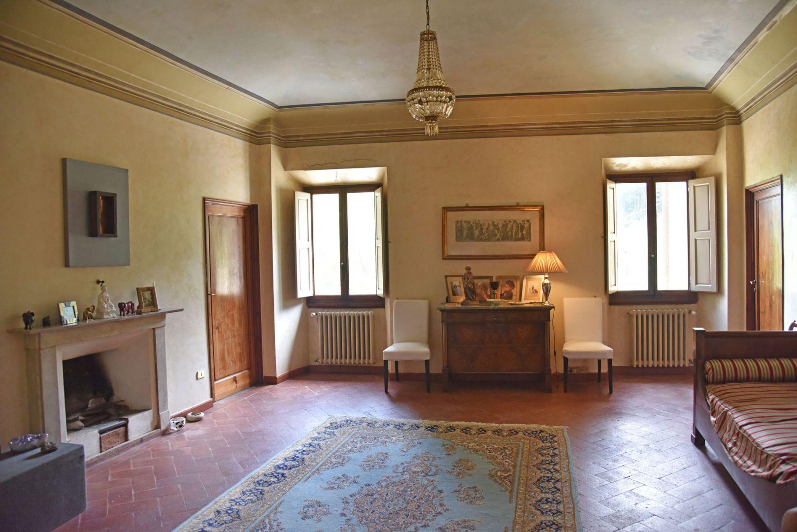 Im ersten Stock befinden sich eine vollständig mit Fresken verzierte Eingangshalle, eine große Empfangshalle von über 60 m² mit einem rosafarbenen Marmorkamin aus dem 17. Jahrhundert, antiken Fresken von Luigi Mussini (bedeutender Maler aus Siena der Romantik – 19. Jahrhundert) und Zugang zum italienischen Garten, ein Wohnzimmer mit einem Renaissance-Kamin aus Pietra Serena und Holzbalken, eine Küche, zwei mit Fresken verzierte Arbeitszimmer, ein Esszimmer mit Zugang zum erhöhten Garten, ein Schlafzimmer, zwei Badezimmer, vier Flure und ein Abstellraum.