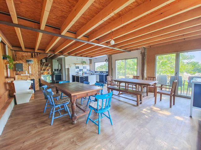 With approximately 248 m² of total living space and accommodations for up to 12 guests, this ensemble is perfectly suited for projects such as market gardening, a gîte, guesthouse, or a self-sufficient lifestyle. The property benefits from autonomous electricity production, ensuring a degree of energy independence.