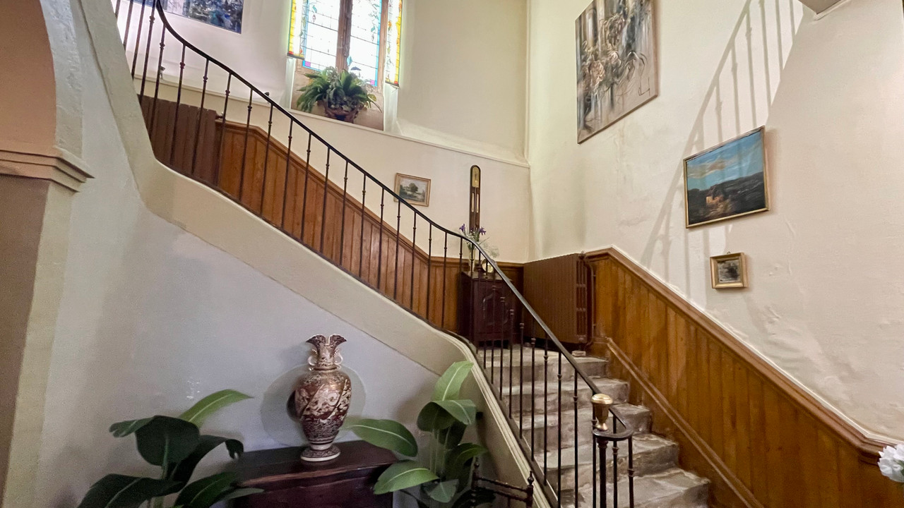 The main house offers over 300 m² of elegant living space with a grand entrance hall, stone staircase, formal reception rooms, study, farmhouse kitchen, 4 double bedrooms, 2 bathrooms, and convertible attic space. Period parquet, tiled floors, and original marble fireplaces throughout.