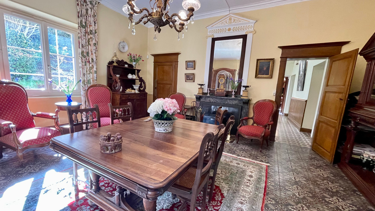 Wooded parkland, landscaped gardens, orangerie (ripe for conversion), natural springs, and various outbuildings: garages, stables, forge, barns. Ample space for a swimming pool.
