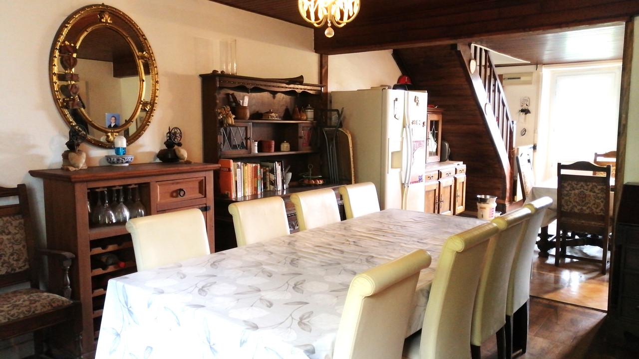 Access to the main house. Entrance hall,giving onto a living room with kitchen and dining room, nice wooden staircase. Corridor leading to a living room, office space. Bathroom. Separate WC. one level bedroom.