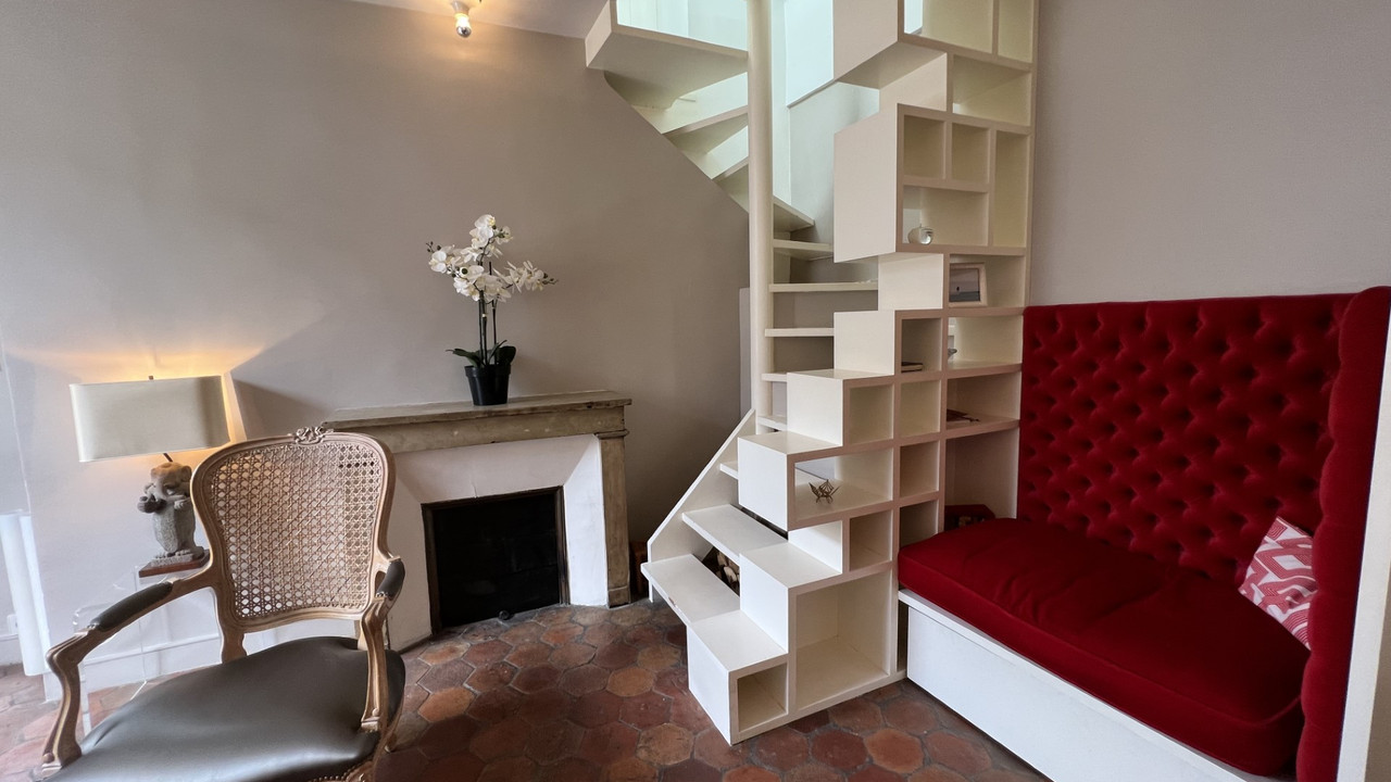 On the upper floor, accessed by an interior staircase, are two bedrooms with velux windows (11.50m2 and 11.18m2). The living room and dining rooms are bright and airy, with unobstructed views of the remarkable Hotel Particulier de Bretonvilliers. South and North exposures.