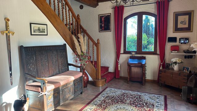 Welcome to this elegant and spacious property, accessed via electric gates and a private, gravelled driveway through a meticulously maintained garden. Built in 1982, this residence exudes charm and modern functionality. The main entrance opens to a large, bright hallway (15.68m²) leading to the kitchen (18.9m²) in front of you, and a spacious living room (58.86m²) on the left. The kitchen is equipped with ample fitted cupboards and offers scenic views of the garden. The inviting living room, featuring air conditioning and a cozy log-burning stove, is generously sized to accommodate a lounge area and dining setup. With four double-glazed doors opening onto a wrap-around terrace, this room is flooded with natural light.