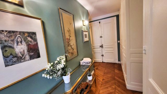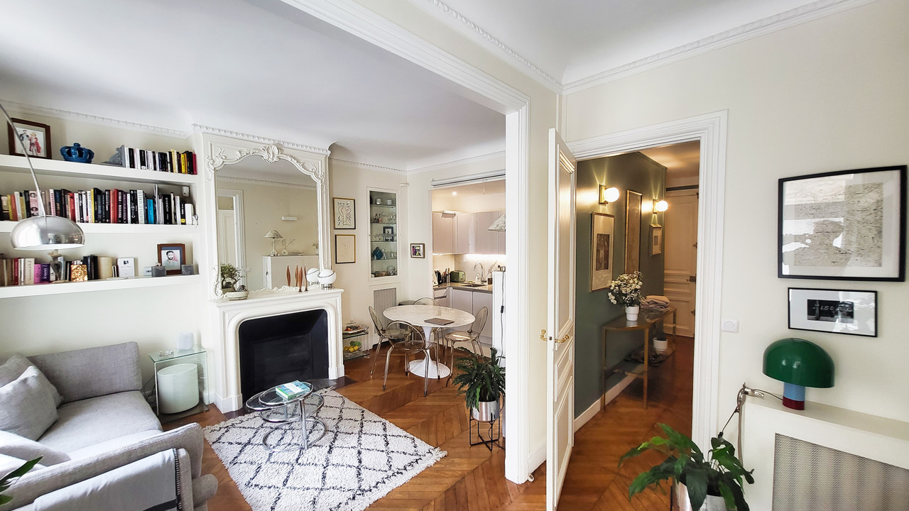 A37541MTC75 - Excellent location for this 2 bed, 68m² ground floor, move-in ready apartment, dripping with Parisian chic in one of the capital's most sought after locations. This high ceiling apartment (up to 3m30) has been tastefully renovated by its owner (working in fashion) and sits in an intimate yet stunning residence, built in 1880 and renovated to the highest standard in 2021. Classic Haussmann period signatures are present (fireplaces, parquet flooring, beautiful plasterwork) along with a modern open kitchen, shower room and separate toilet. The versatile living space can easily accommodate a small family, home office and dining area. The master bedroom has a fireplace and large east facing window, the second bedroom features discrete built-in storage (as does the entrance). The exceptional location grants easy access on foot to museums, theatres, restaurants, shopping and groceries. For the rest of Paris just hop on the métro at Villiers (Line 3) less than 100m away. Monthly charges €173.