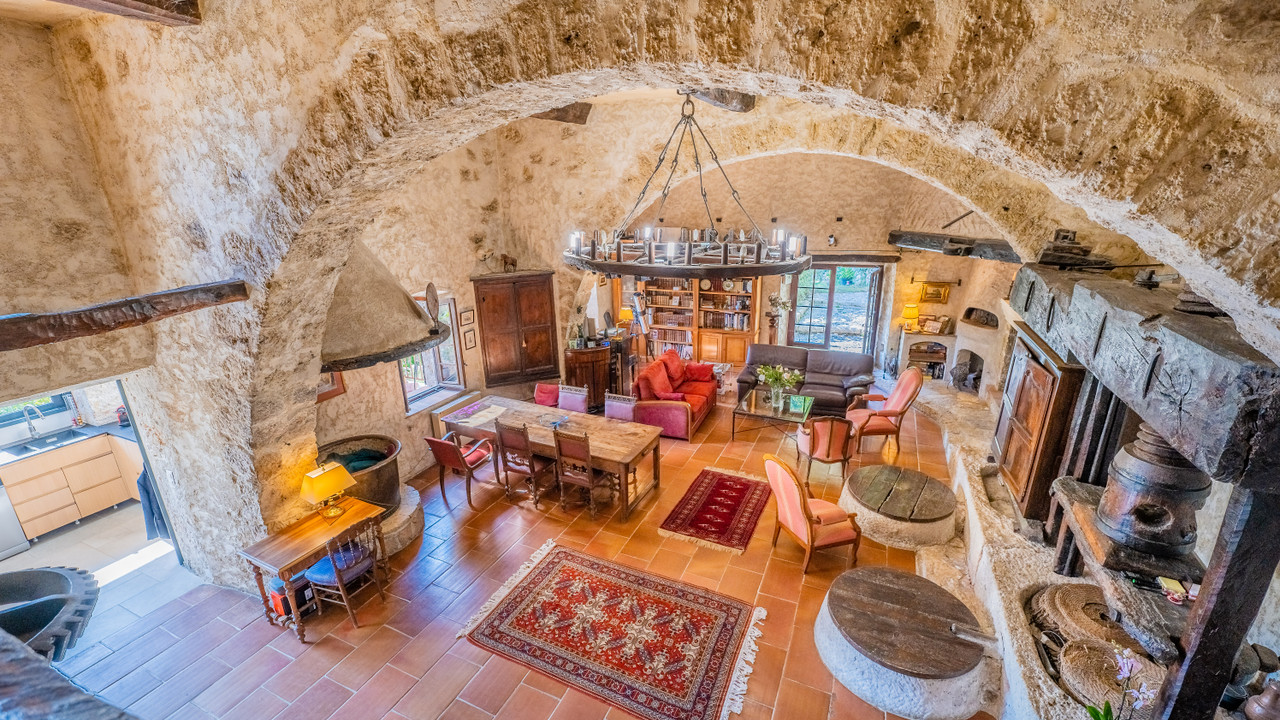 A14004 - Step into history with this cosy 17th-century stone house, once an olive oil mill. The well-preserved property exudes character and charm, with a generous 250 m2 living space divided into two wings, connected by the mill's original paddle wheel, still partially preserved.