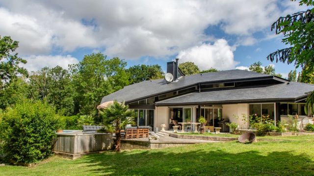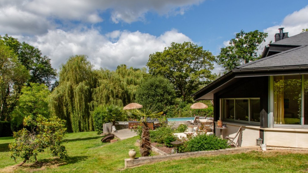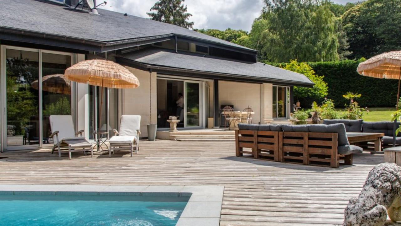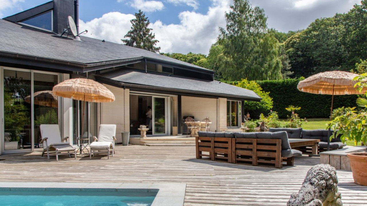 A35046BTX78 - Located near Montfort l'Amaury (78490), on the edge of the Rambouillet forest, this 250 m² architect-designed house sits on a landscaped 3,400 m² plot. Bright and functional, it features a spacious living room with a cathedral ceiling and fireplace, an open-plan kitchen, 4 bedrooms including a master suite, and a mezzanine. The exotic wood terrace overlooks a private garden and a heated swimming pool (8x4 m) with a counter-current system. Skatepark for training. Covered parking, electric heating, and close to Montfort-l'Amaury and Méré train station (Paris Montparnasse in 40 min). A rare opportunity, just 37 km from Paris.