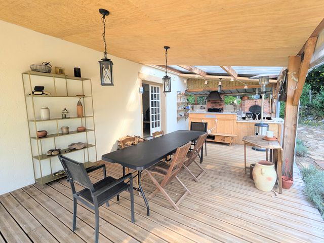 Outdoors, the home continues to impress with new fencing, a profusion of fruit and olive trees, a wood terrace, and a charming garden cabin.