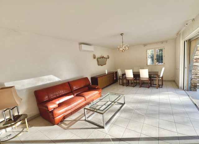 Ground-floor apartment: entrance with closet, fully equipped kitchen, one bedroom, one bathroom, separate toilet, and a spacious living room with an insert fireplace opening onto a 70 m² travertine terrace, partially covered, with a magnificent view of the castle. Possibility to create a second bedroom.