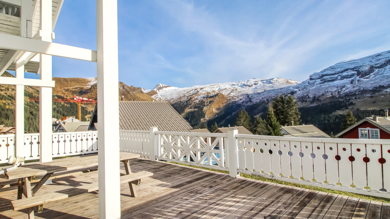 A32412JST74 - Charming 4 bedroom chalet for sale in the heart of Hameau de Flaine, featuring a spacious south-east facing terrace with views over the pistes.