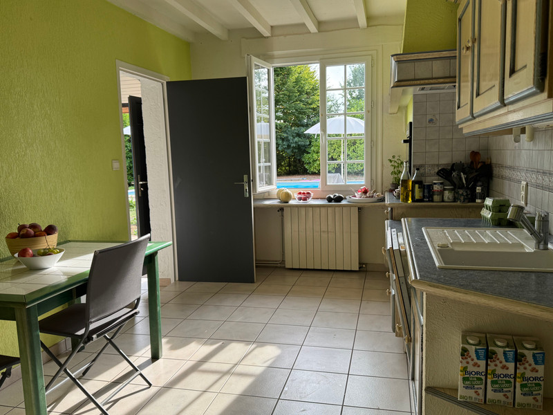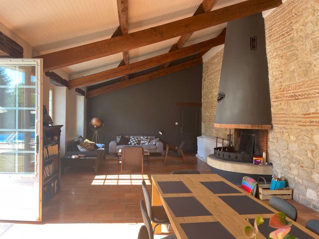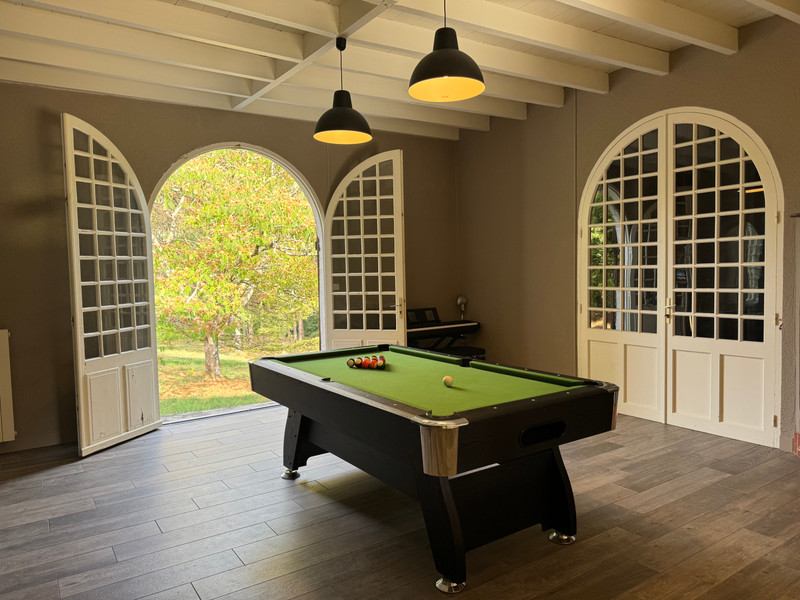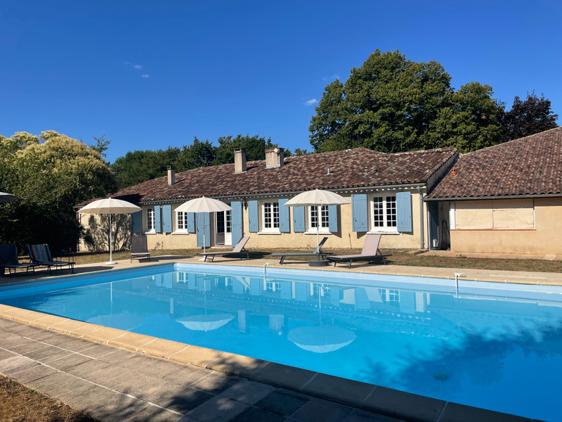 Entrance to the front with large stone hallway with stone fireplace (now used as office), through to fabulous living room with beautiful stone wall featuring the Lot et Garonne stone and brick, also open fire and feature full height chimney, a stunning room, opening out onto rear gardens and swimming pool and terraces. Kitchen with fitted units and breakfast space, door to gardens, utility room with fitted cupboards, swimming pool room with new pump and filter and pipework, bathroom with bath, shower Wc and wash basins.