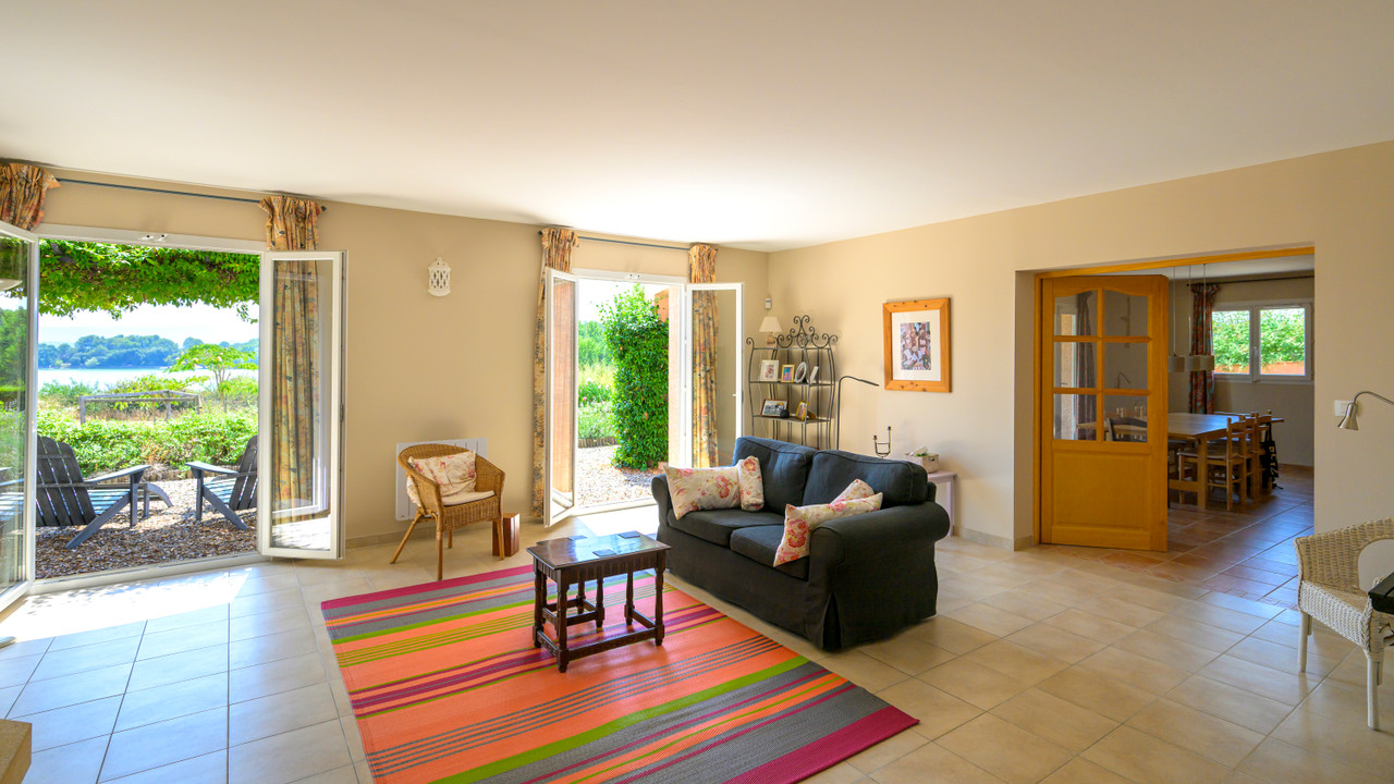 Covered terrace, enclosed garden with lakeside access, and heated swimming pool.