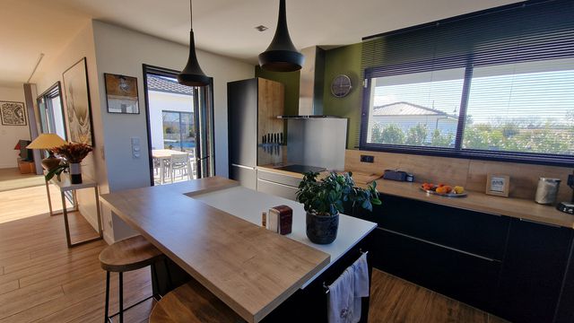 Bathed in natural light and facing south, this single-storey villa captivates with its clean lines and serene ambiance. Opening onto expansive terraces and a heated 8 x 2.5 m swimming pool, the home sits on a beautifully landscaped 850 m² plot, complete with a lawn, a 30 m² garage, and multiple parking spaces.