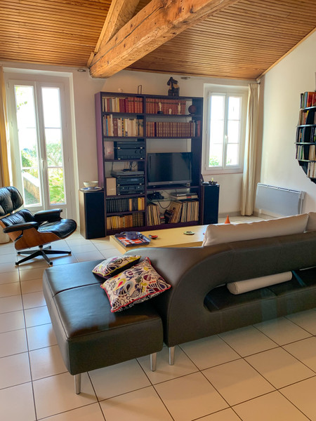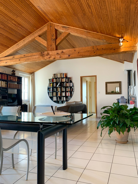 The home features 4 bedrooms, two bathrooms with one separate WC. The family room of 42m2 offers vaulted wood slatted ceiling, exposed beams and clean lines.