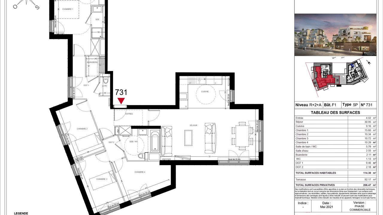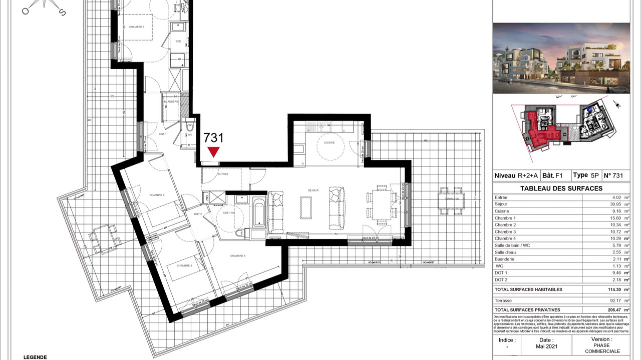 A10432 - 78400, Chatou, high-end SE facing apartment (5 rooms - 4 bedrooms - 3 bathrooms - see floor plan) offering 114m2 + 92m2 terrace and 3 parking spots, bright & ultra-modern with optimized space ready to move in 2nd trimester 2024, situated on the 3rd floor of a contemporary building, in the heart of a dynamic and lively city, an ideal location a few minutes from Paris, ideal for families and working professionals.