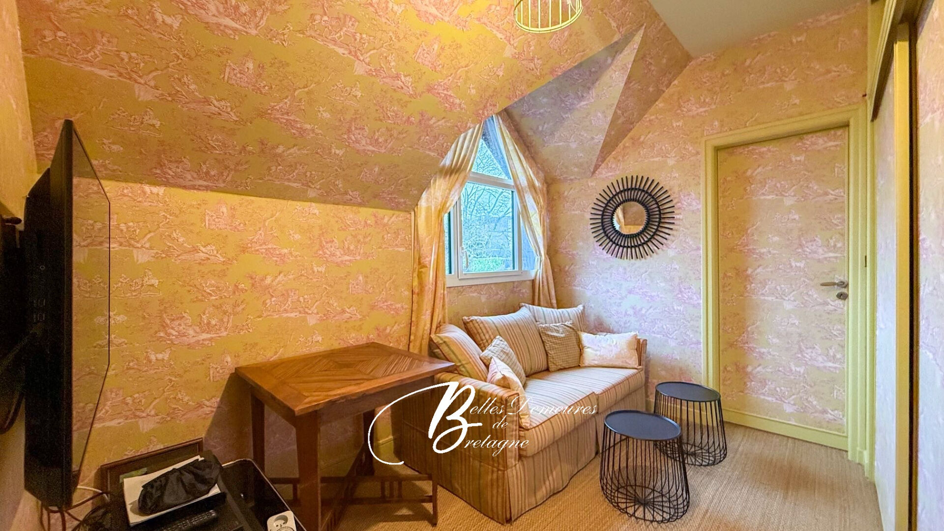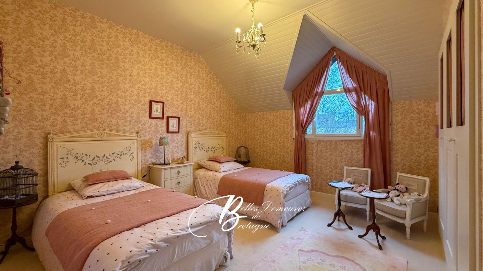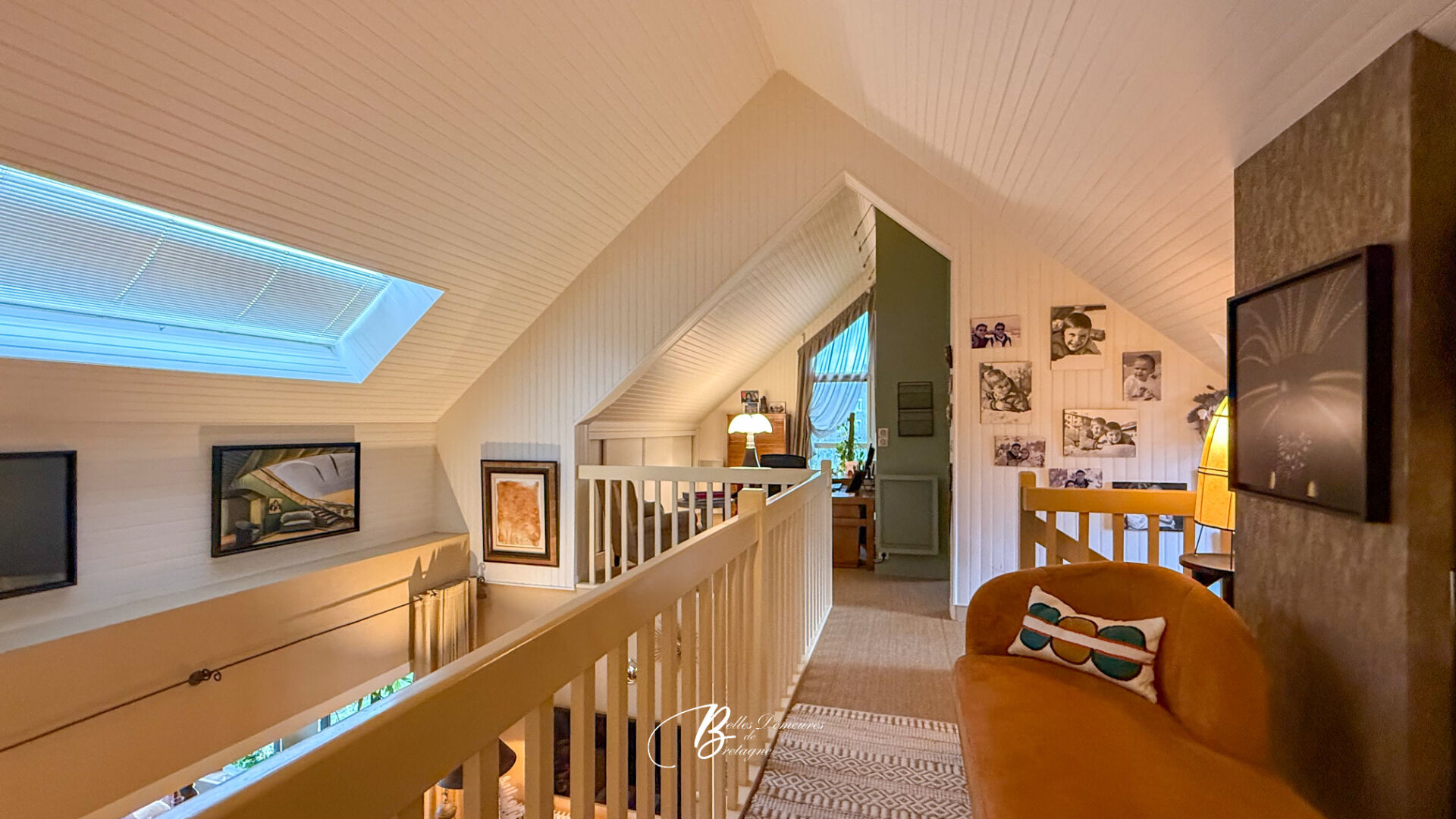 L'étage s'organise autour d'une large mezzanine accueillant un bureau et un espace bibliothèque. Trois chambres, un petit salon et une vaste pièce pouvant servir de salle de jeux ou de grande chambre complètent ce niveau.