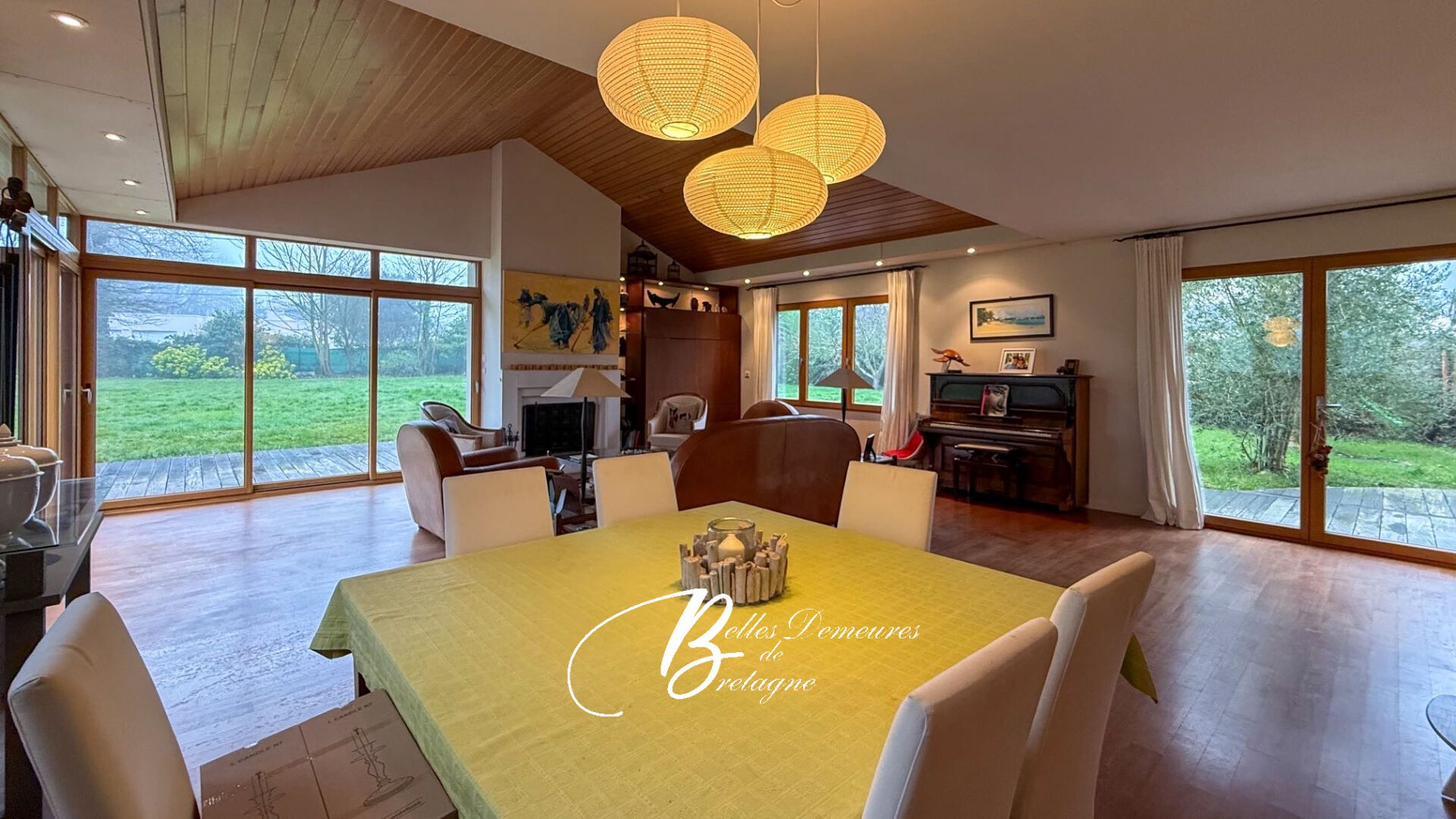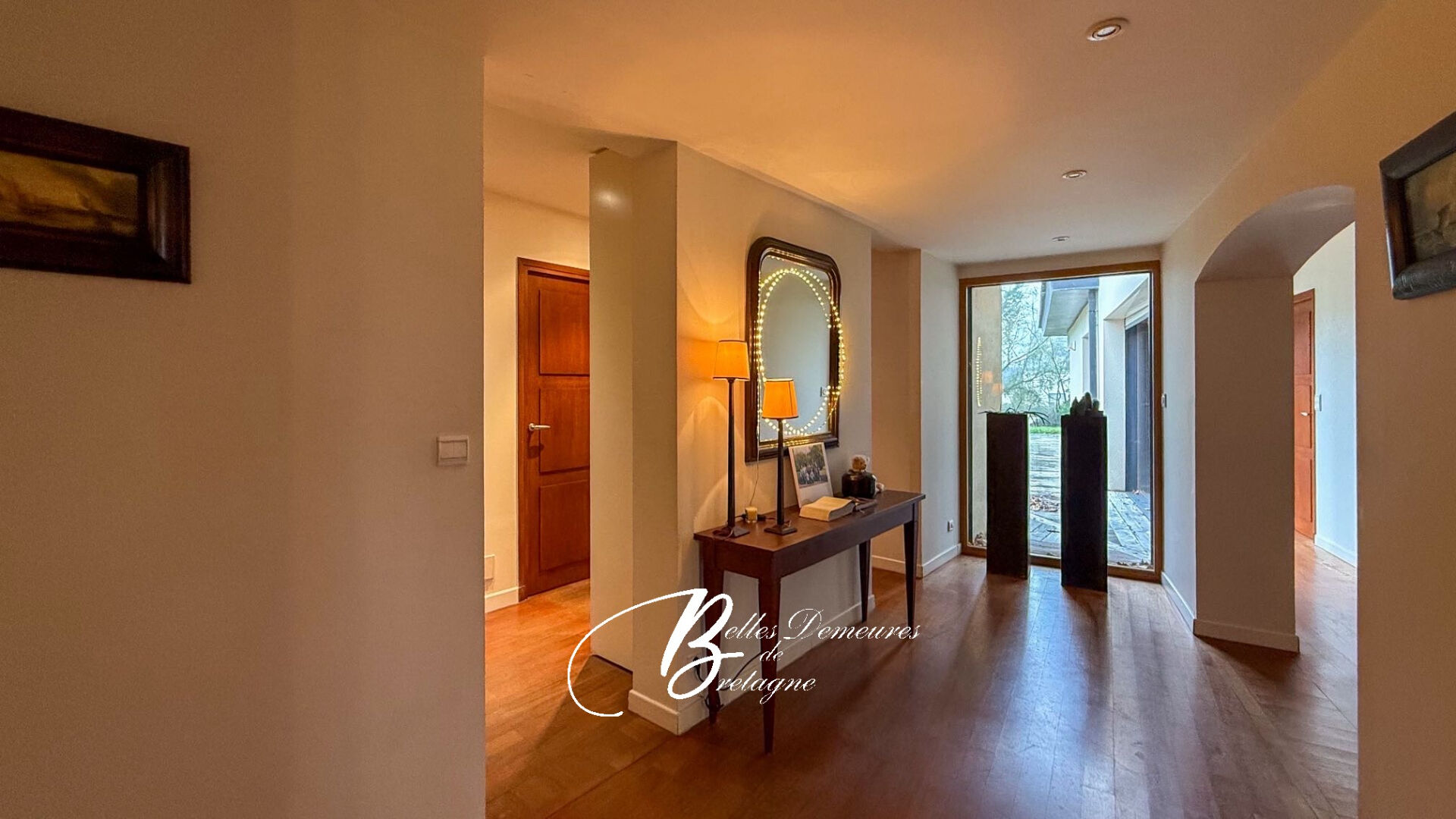 Pensée pour permettre une vie de plain-pied (198 m² en plain-pied), la maison s'ouvre sur une vaste entrée menant à un espace de vie lumineux de plus de 60 m². Le salon-séjour, sublimé par un plafond cathédrale et une cheminée, bénéficie de larges ouvertures donnant accès au jardin et à la terrasse récemment rénovée. La cuisine, élégamment aménagée autour de son îlot central, complète cet espace convivial et fonctionnel.