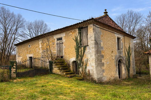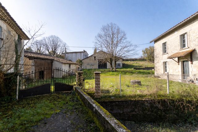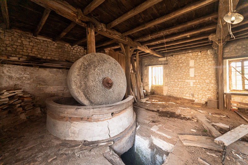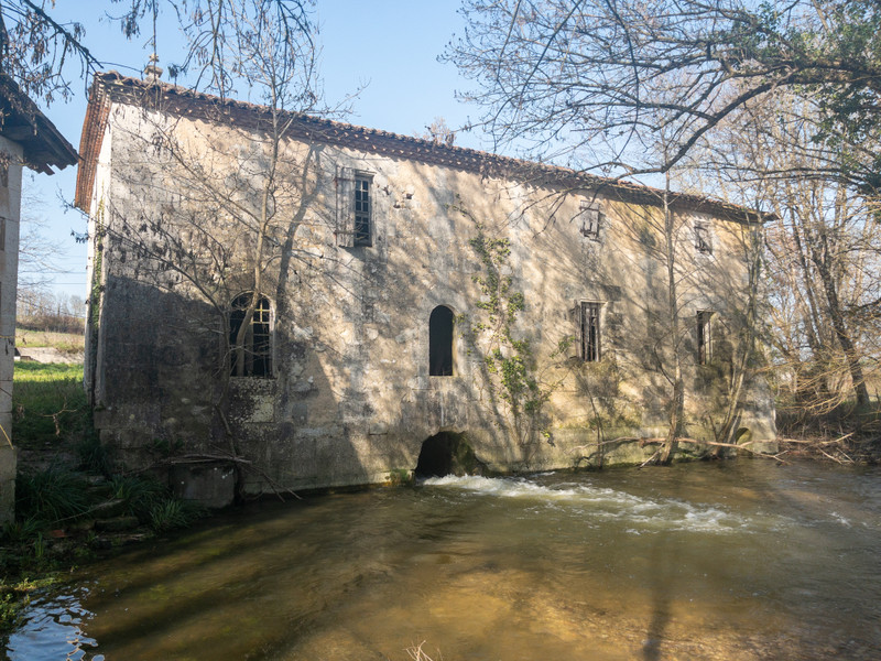 This rare property complex comprises a watermill in need of renovation, a traditional Charentaise house ready to move into, two large barns/stables, and a bread oven.