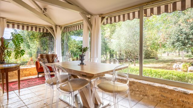 The wrought iron gate opens onto a landscaped driveway with parking and carport. The house has a total of five bedrooms and was built with high-quality materials (18th-century fireplace, textured wallpaper, fine wood doors, staircase, etc.) and the layout of the rooms offers a perfect coherence. The ground floor has a master bedroom and the first floor has three further bedrooms, one of which has an en-suite bathroom. A fifth bedroom with a shower room has independent access from the outside on the ground floor.