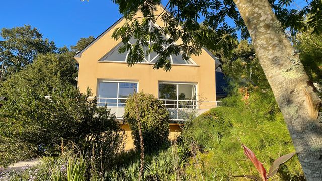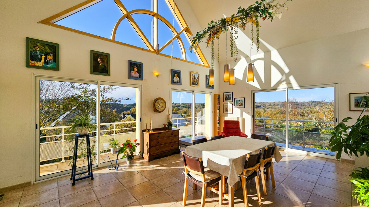 A40285EAM56 - Constructed by the present owners in 2005, this modern four-bedroom home combines comfort, efficiency and light-filled design. Its elevated setting offers sweeping views, with sunsets enjoyed from wraparound terrace. Generous insulation, a recently replaced condensing gas boiler (1,200L underground tank) and a log burner ensure year-round warmth, while multiple patio doors flood the interiors with natural light. The ground floor includes a striking garden room with vaulted ceiling, lounge, kitchen, shower room with WC, guest WC and two double bedrooms. Upstairs are two further bedrooms, a shower room, mezzanine studio and walk-in attic storage. The sous-sol provides secure parking for two cars, workshop, utility, storage and WC. Outside, landscaped grounds with powered shutters, terrace awning, greenhouse and 5,000L water recovery system, a practical well maintained property ready to move into.
