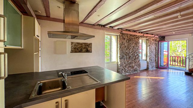 With a total floor area of 78.67 sqm and a balcony, the apartment stands out for its harmonious blend of original hardwood floors and exposed stone walls, creating a warm and authentic atmosphere.