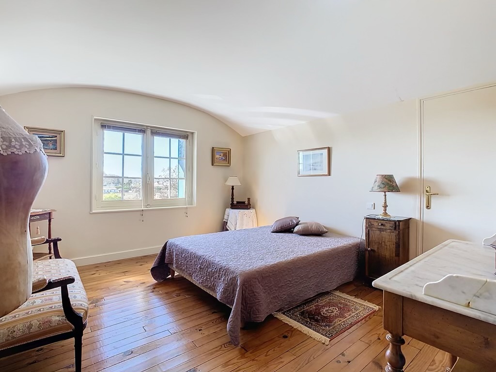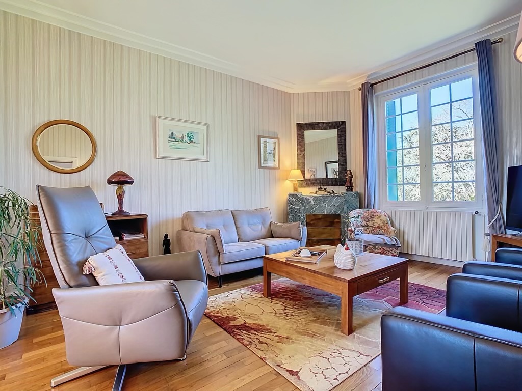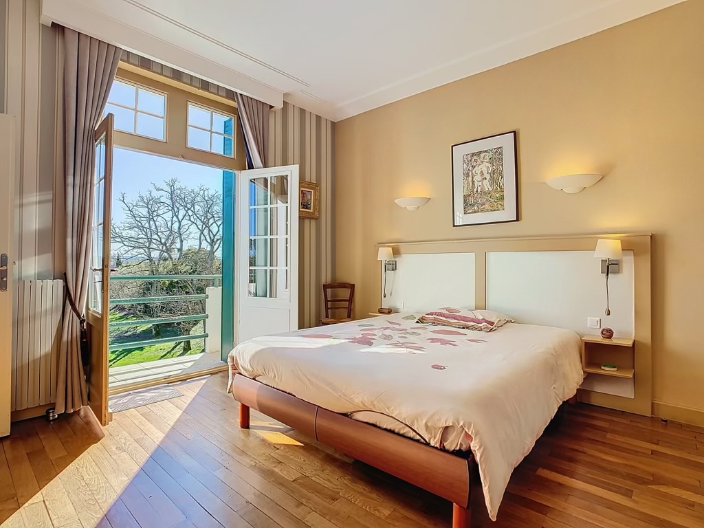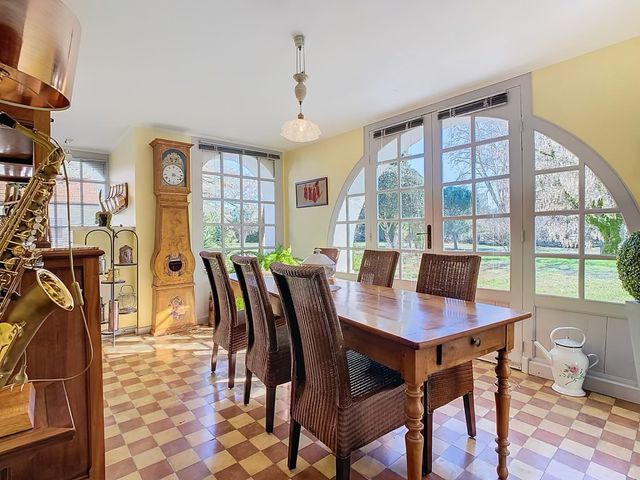 This property features a 9,000 m² enclosed and landscaped garden with a swimming pool and terrace, a double garage (80 m²), and a carport.