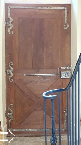 A beautiful historic wooden door opens into the entrance hall, where an elegant wooden staircase leads to the upper floors.
