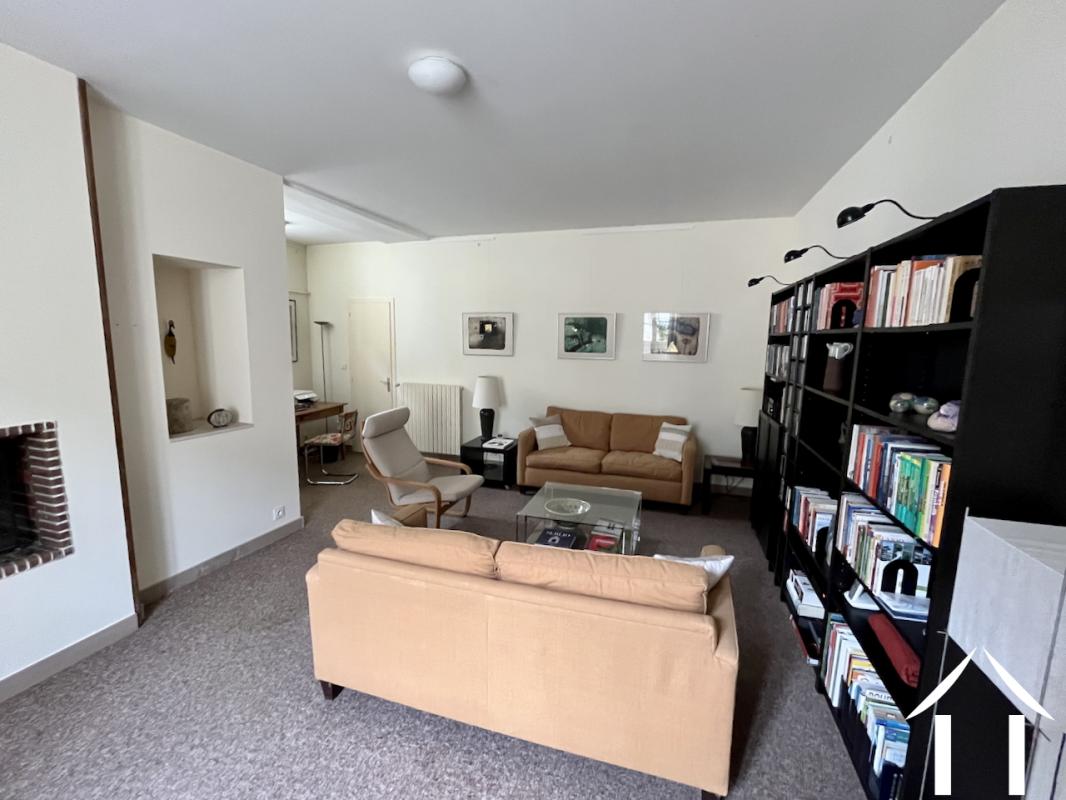 A 25 m² living room (salon) with a fireplace, offering a warm and welcoming atmosphere