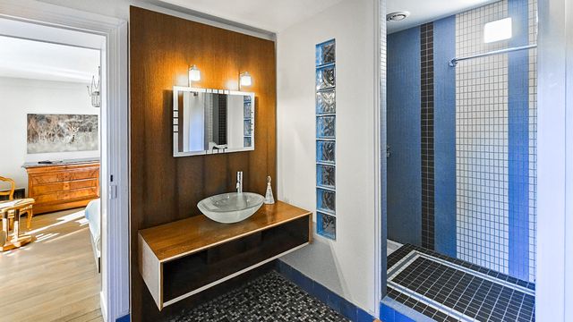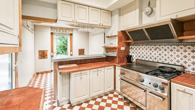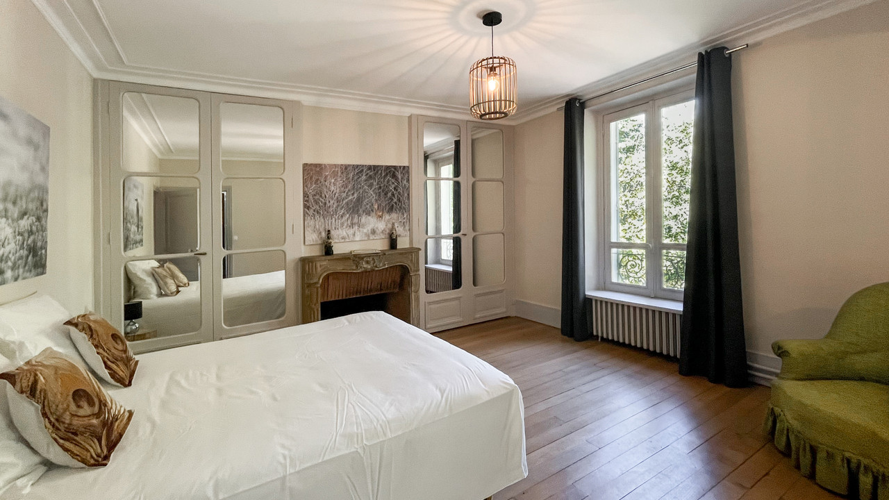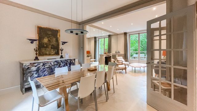 As soon as you enter, with its Belgian black marble and Saumur stone, you will be charmed by the character of the place. The vast 31.9 m² living room, bathed in light, features rare lemonwood and Madagascan violet wood parquet flooring, reflecting the owner's cabinetmaking skills. A 32.3 m² dining room and an 18.3 m² kitchen complete this reception area.
